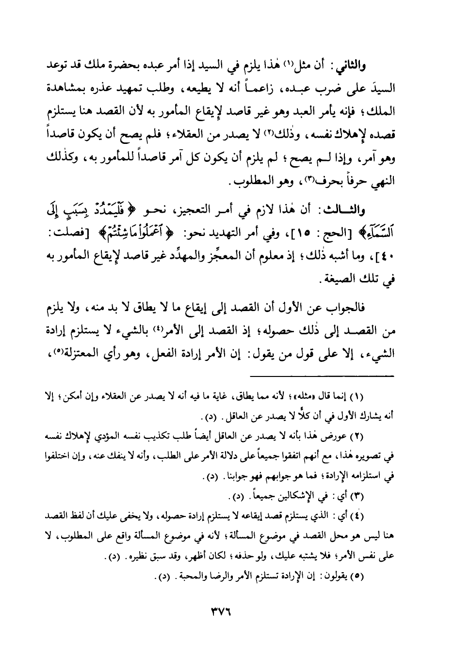 أَنَّ هَذَا لَازِمٌ فِي أَمْرِ التَّعْجِيزِ، نَحْوَ {فَلْيَمْدُدْ بِسَبَبٍ إِلَى السَّمَاءِ} [الْحَجِّ: 15] ، وَفِي أَمْرِ التَّهْدِيدِ نَحْوَ: {اعْمَلُوا مَا شِئْتُمْ} [فُصِّلَتْ: 40] ، وَمَا أَشْبَهَ ذَلِكَ؛ إِذْ مَعْلُومٌ أَنَّ الْمُعْجِزَ وَالْمُهَدِّدَ غَيْرُ قَاصِدٍ لِإِيقَاعِ الْمَأْمُورِ بِهِ فِي تِلْكَ الصِّيغَةِ.