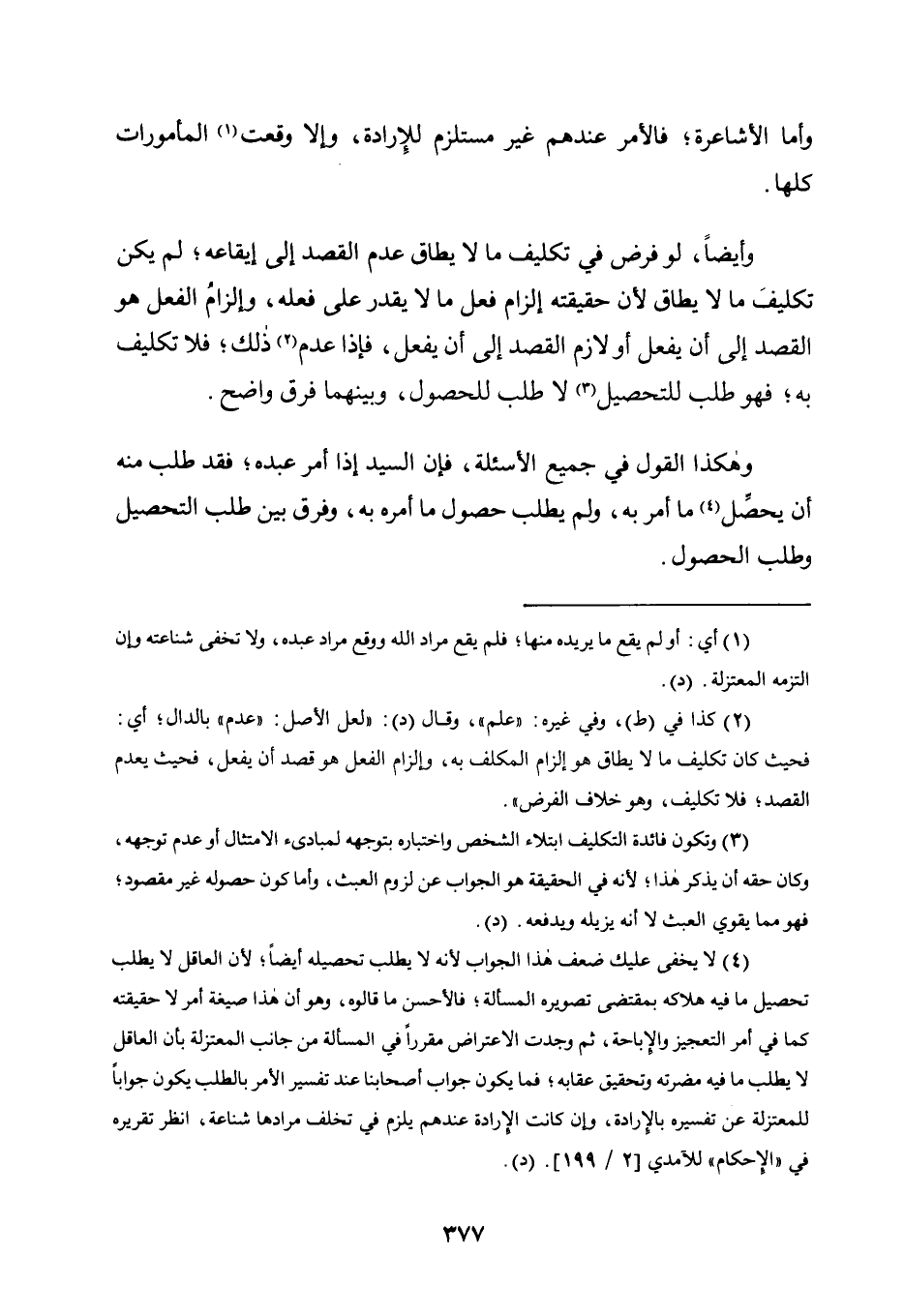 4 لا يخفى عليك ضعف هذا الجواب لأنه لا يطلب تحصيله أيضا؛ لأن العاقل لا يطلب تحصيل ما فيه هلاكه بمقتضى تصويره المسألة؛ فالأحسن ما قالوه، وهو أن هذا صيغة أمر لا حقيقته كما في أمر التعجيز والإباحة، ثم وجدت الاعتراض مقررا في المسألة من جانب المعتزلة بأن العاقل لا يطلب ما فيه مضرته وتحقيق عقابه؛ فما يكون جواب أصحابنا عند تفسير الأمر بالطلب يكون جوابًا للمعتزلة عن تفسيره بالإرادة، وإن كانت الإرادة عندهم يلزم في تخلف مرادها شناعة، انظر تقريره في "الإحكام" للآمدي [2/ 119] . "د".