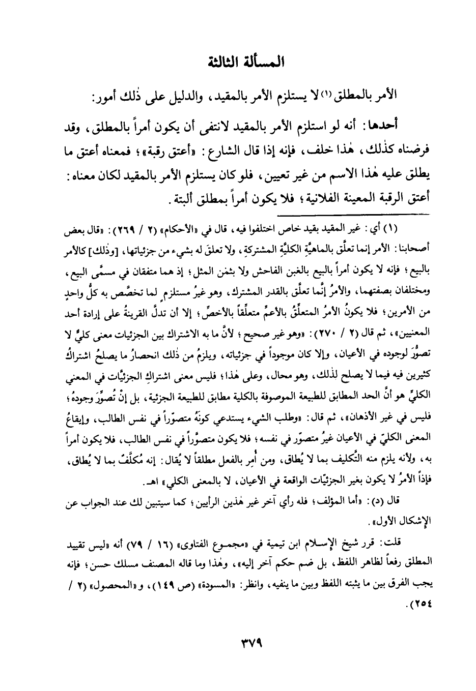 الْأَمْرُ بِالْمُطْلَقِ1 لَا يَسْتَلْزِمُ الْأَمْرَ بِالْمُقَيَّدِ، وَالدَّلِيلُ عَلَى ذَلِكَ أُمُورٌ: