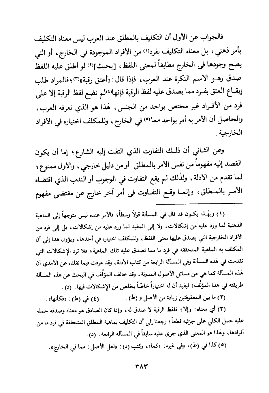 1 وبهذا يكون قد قال في المسألة قولًا وسطًا؛ فالأمر عنده ليس متوجهًا إلى الماهية الذهنية لما ورد عليه من إشكالات، ولا إلى المقيد لما ورد عليه من إشكالات، بل إلى فرد من الأفراد الخارجية التي يصدق عليها معنى اللفظ، وللمكلف اختياره في أحدها، ويؤول هذا إلى أن المكلف به الماهية المتحققة في فرد ما مما تصدق عليه تلك الماهية؛ فلا ترد الإشكالات التي تقدمت في هذه المسألة وفي المسألة الرابعة من كتاب الأدلة، وقد عرفت فيما نقلناه عن الآمدي أن هذه المسألة كما هي من مسائل الأصول المدونة، وقد خالف المؤلِّف في البحث عن هذه المسألة طريقته في هذا المؤلَّف؛ ليفيد أن له اختيارًا خاصًا يخلص من الإشكالات فيها. "د".