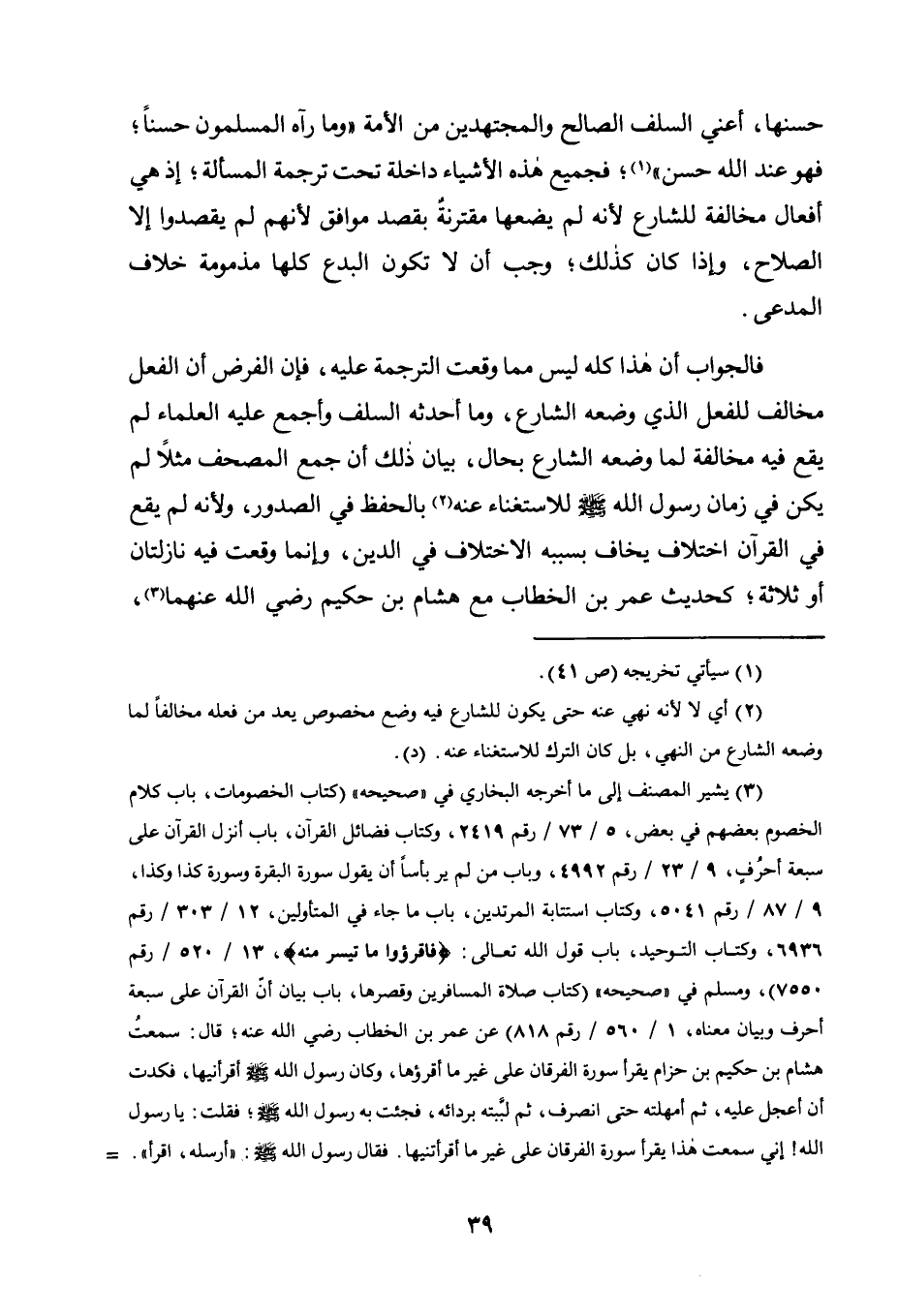 فَالْجَوَابُ أَنَّ هَذَا كُلَّهُ لَيْسَ مِمَّا وَقَعَتِ التَّرْجَمَةُ عَلَيْهِ، فَإِنَّ الْفَرْضَ أَنَّ الْفِعْلَ مُخَالِفٌ لِلْفِعْلِ الَّذِي وَضَعَهُ الشَّارِعُ، وَمَا أَحْدَثَهُ السَّلَفُ وَأَجْمَعَ عَلَيْهِ الْعُلَمَاءُ لَمْ يَقَعْ فِيهِ مُخَالَفَةٌ لِمَا وَضَعَهُ الشَّارِعُ بِحَالٍ، بَيَانُ ذَلِكَ أَنَّ جَمْعَ الْمُصْحَفِ مَثَلًا لَمْ يَكُنْ فِي زَمَانِ رَسُولِ اللَّهِ صَلَّى اللَّهُ عَلَيْهِ وَسَلَّمَ لِلِاسْتِغْنَاءِ عَنْهُ2 بِالْحِفْظِ فِي الصُّدُورِ، وَلِأَنَّهُ لَمْ يَقَعْ فِي الْقُرْآنِ اخْتِلَافٌ يُخَافُ بِسَبَبِهِ الِاخْتِلَافُ فِي الدِّينِ، وَإِنَّمَا وَقَعَتْ فِيهِ نَازِلَتَانِ أَوْ ثَلَاثَةٌ؛ كَحَدِيثِ عُمَرَ بْنِ الْخَطَّابِ مَعَ هِشَامِ بن حكيم رضي الله عنهما3،