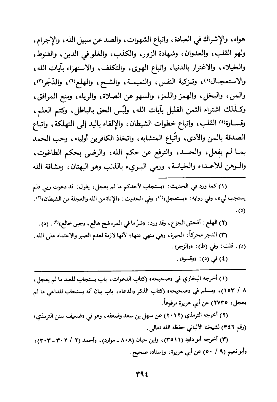 هَوَاهُ، وَالْإِشْرَاكُ فِي الْعِبَادَةِ، وَاتِّبَاعُ الشَّهَوَاتِ، وَالصَّدُّ عَنْ سَبِيلِ اللَّهِ، وَالْإِجْرَامُ، وَلَهْوُ الْقَلْبِ، وَالْعُدْوَانُ، وَشَهَادَةُ الزُّورِ، وَالْكَذِبُ، وَالْغُلُوُّ فِي الدِّينِ، وَالْقُنُوطُ، وَالْخُيَلَاءُ، وَالِاغْتِرَارُ بِالدُّنْيَا، وَاتِّبَاعُ الْهَوَى، وَالتَّكَلُّفُ، وَالِاسْتِهْزَاءُ بِآيَاتِ اللَّهِ، وَالِاسْتِعْجَالُ1، وَتَزْكِيَةُ النَّفْسِ، وَالنَّمِيمَةُ، وَالشُّحُّ، وَالْهَلَعُ2، وَالدَّجَرُ3، وَالْمَنُّ، وَالْبُخْلُ، وَالْهَمْزُ وَاللَّمْزُ، وَالسَّهْوُ عَنِ الصَّلَاةِ، وَالرِّيَاءُ، وَمَنْعُ الْمَرَافِقِ، وَكَذَلِكَ اشْتِرَاءُ الثَّمَنِ الْقَلِيلِ بِآيَاتِ اللَّهِ، وَلُبْسُ الْحَقِّ بِالْبَاطِلِ، وكتم العلم، وقساوة4 الْقَلْبِ، وَاتِّبَاعُ خُطُوَاتِ الشَّيْطَانِ، وَالْإِلْقَاءُ بِالْيَدِ إِلَى التَّهْلُكَةِ، وَإِتْبَاعُ الصَّدَقَةِ بِالْمَنِّ وَالْأَذَى، وَاتِّبَاعُ الْمُتَشَابِهِ، وَاتِّخَاذُ الْكَافِرِينَ أَوْلِيَاءَ، وَحُبُّ الْحَمْدِ بِمَا لَمْ يفعل، والحسد، والترفع عن حكم الله، والرضى بِحُكْمِ الطَّاغُوتِ، وَالْوَهْنُ لِلْأَعْدَاءِ وَالْخِيَانَةُ، وَرَمْيُ الْبَرِيءِ بالذنب وهو البهتان، ومشاقة الله