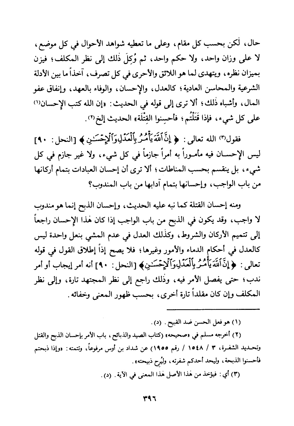 وَمِنْهُ إِحْسَانُ الْقِتْلَةِ كَمَا نَبَّهَ عَلَيْهِ الْحَدِيثُ، وَإِحْسَانُ الذَّبْحِ إِنَّمَا هُوَ مَنْدُوبٌ لَا وَاجِبٌ، وَقَدْ يَكُونُ فِي الذَّبْحِ مِنْ بَابِ الْوَاجِبِ إِذَا كَانَ هَذَا الْإِحْسَانُ رَاجِعًا إِلَى تَتْمِيمِ الْأَرْكَانِ وَالشُّرُوطِ، وَكَذَلِكَ الْعَدْلُ فِي عَدَمِ الْمَشْيِ بِنَعْلٍ وَاحِدَةٍ لَيْسَ كالعدل في أحكام الدماء والأمور وَغَيْرِهَا؛ فَلَا يَصِحُّ إِذًا إِطْلَاقُ الْقَوْلِ فِي قَوْلِهِ تَعَالَى: {إِنَّ اللَّهَ يَأْمُرُ بِالْعَدْلِ وَالْأِحْسَانِ} [النَّحْلِ: 90] أَنَّهُ أَمْرُ إِيجَابٍ أَوْ أَمْرُ نَدْبٍ؛ حَتَّى يُفَصَّلَ الْأَمْرُ فِيهِ، وَذَلِكَ رَاجِعٌ إِلَى نَظَرِ الْمُجْتَهِدِ تَارَةً، وَإِلَى نَظَرِ الْمُكَلَّفِ وَإِنْ كَانَ مُقَلِّدًا تَارَةً أُخْرَى، بِحَسَبِ ظُهُورِ الْمَعْنَى وخفائه.