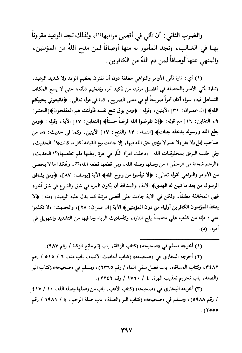 1 أي: تارة تأتي الأوامر والنواهي مطلقة دون أن تقترن بعظيم الوعد ولا شديد الوعيد، وتارة يأتي الأمر بالخصلة في أفضل مرتبته من تأكيد أمره وتفخيم شأنه؛ حتى لا يسع المكلف التساهل فيه، سواء أكان أمرًا صريحًا أم في معنى الصريح؛ كما في قوله تعالى: {فَاتَّبِعُونِي يُحْبِبْكُمُ اللَّه} [آل عمران: 31] الآيتين، وقوله: {وَمَنْ يُوقَ شُحَّ نَفْسِهِ فَأُولَئِكَ هُمُ الْمُفْلِحُونَ} [الحشر: 9، التغابن: 16] مع قوله: {إِنْ تُقْرِضُوا اللَّهَ قَرْضًا حَسَنًا} [التغابن: 17] الآية، وقوله: {وَمَنْ يُطِعِ اللَّهَ وَرَسُولَهُ يُدْخِلْهُ جَنَّاتٍ} [النساء: 13 والفتح: 17] الآيتين، وكما في حديث: "ما من صاحب إبل ولا بقر ولا غنم لا يؤدي حق الله فيها؛ إلا جاءت يوم القيامة أكثر ما كانت" * الحديث، وفي طلب الرفق بمخلوقات الله: "دخلت امرأة النار في هرة ربطتها فلم تطعمها" ** الحديث، "الرحمة شجنة من الرحمن؛ من وصلها وصله الله، ومن قطعها قطعه الله" ***، وهكذا ما لا يحصى من الأوامر والنواهي لقوله تعالى: {لا تَيْأَسُوا مِنْ رَوْحِ اللَّه} الآية [يوسف: 87] ، {وَمَنْ يُشَاقِقِ الرَّسُولَ مِنْ بَعْدِ مَا تَبَيَّنَ لَهُ الْهُدَى} الآية، والمشاقة أن يكون المرء في شقٍ والشرع في شقٍ آخر؛ فهي المخالفة مطلقًا، ولكن في الآية جاءت على أقصى مرتبة كما يدل عليه الوعيد، ومنه: {لا يَتَّخِذِ الْمُؤْمِنُونَ الْكَافِرِينَ أَوْلِيَاءَ مِنْ دُونِ الْمُؤْمِنِين} الآية [آل عمران: 28] ، والحديث: "لا تكذبوا علي؛ فإنه من كذب علي متعمدًا يلج النار"، وكأحاديث الرياء وما فيها من التشديد والتهويل في أمره. "د".