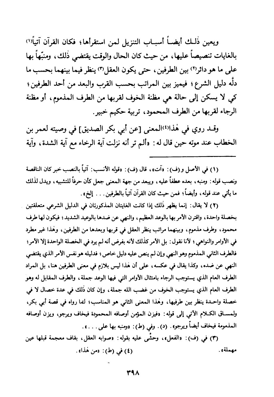 وَيُعَيِّنُ ذَلِكَ أَيْضًا أَسْبَابُ التَّنْزِيلِ لِمَنِ اسْتَقْرَأَهَا؛ فَكَانَ الْقُرْآنُ آتِيًا1 بِالْغَايَاتِ تَنْصِيصًا عَلَيْهَا، مِنْ حَيْثُ كَانَ الْحَالُ وَالْوَقْتُ يَقْتَضِي ذَلِكَ، وَمُنَبِّهًا بِهَا عَلَى مَا هُوَ دَائِرٌ2 بَيْنَ الطَّرَفَيْنِ، حَتَّى يَكُونَ الْعَقْلُ3 يَنْظُرُ فِيمَا بَيْنَهُمَا بِحَسَبِ مَا دَلَّهُ دَلِيلُ الشَّرْعِ؛ فَيُمَيِّزُ بَيْنَ الْمَرَاتِبِ بِحَسَبِ الْقُرْبِ وَالْبُعْدِ مِنْ أَحَدِ الطَّرَفَيْنِ؛ كَيْ لَا يَسْكُنَ إِلَى حَالَةٍ هِيَ مَظِنَّةُ الْخَوْفِ لِقُرْبِهَا مِنَ الطَّرَفِ الْمَذْمُومِ، أَوْ مَظِنَّةُ الرَّجَاءِ لِقُرْبِهَا مِنَ الطَّرَفِ الْمَحْمُودِ، تَرْبِيَةُ حَكِيمٍ خَبِيرٍ.