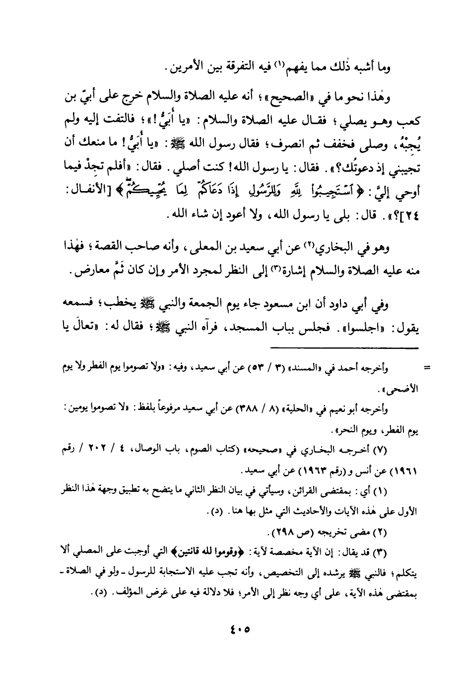 وَهَذَا نَحْوَ مَا فِي "الصَّحِيحِ"؛ أَنَّهُ عَلَيْهِ الصَّلَاةُ وَالسَّلَامُ خَرَجَ عَلَى أُبَيِّ ابن كَعْبٍ وَهُوَ يُصَلِّي؛ فَقَالَ عَلَيْهِ الصَّلَاةُ وَالسَّلَامُ: "يَا أُبَيُّ! "؛ فَالْتَفَتَ إِلَيْهِ وَلَمْ يُجِبْهُ، وَصَلَّى فخفف فَخَفَّفَ ثُمَّ انْصَرَفَ؛ فَقَالَ رَسُولُ اللَّهِ صَلَّى اللَّهُ عَلَيْهِ وَسَلَّمَ: "يَا أُبَيُّ! مَا مَنَعَكَ أن تجيبني إذ دَعَوْتُكَ؟ ". فَقَالَ: يَا رَسُولَ اللَّهِ! كُنْتُ أُصَلِّي. فَقَالَ: "أَفَلَمْ تَجِدْ فِيمَا أُوحِيَ إِلَيَّ: {اسْتَجِيبُوا لِلَّهِ وَلِلرَّسُولِ إِذَا دَعَاكُمْ لِمَا يُحْيِيكُمْ} [الْأَنْفَالِ: 24] ؟ ". قَالَ: بَلَى يَا رَسُولَ اللَّهِ، وَلَا أَعُودُ إِنْ شَاءَ اللَّهُ.