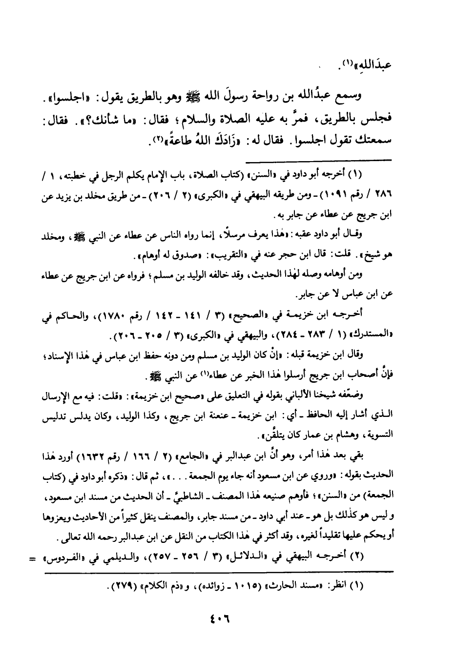بقي بعد هذا أمر، وهو أن ابن عبد البر في "الجامع" "2/ 166/ 1632" أورد هذا الحديث بقوله: "وروي عن ابن مسعود أنه جاء يوم الجمعة ... "، ثم قال: "ذكره أبو داود في "كتاب الجمعة" من "السنن"؛ فأوهم صنيعه هذا المصنف -الشاطبي- أن الحديث من مسند ابن مسعود، وليس هو كذلك بل هو -عن أبي داود- من مسند جابر، والمصنف ينقل كثيرًا من الأحاديث ويعزوها أو يحكم عليها تقليدًا لغيره، وقد أكثر في هذا الكتاب من النقل عن ابن عبد البر رحمه الله تعالى.