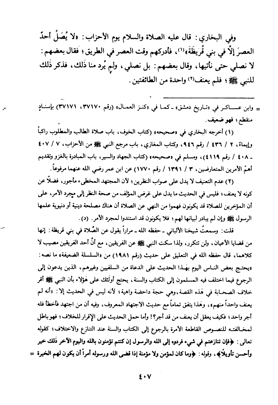 قلت: وسمعت شيخنا الألباني -حفظه الله- مرارًا يقول عن الصلاة في بني قريظة: إنها من قضايا الأعيان، ولن تتكرر، ولذا سكت النبي صلى الله عليه وسلم عن الفريقين، مع أن أحد الفريقين مصيب لا كلاهما، قال حفظه الله في التعليق على حديث "رقم 1981" من "السلسة الضعيفة" ما نصه: "يحتج بعض الناس اليوم بهذا الحديث على الدعاة من السلفيين، وغيرهم، الذين يدعون إلى الرجوع فيما اختلف فيه المسلمون إلى الكتاب والسنة، يحتج أولئك على هؤلاء بأن النبي صلى الله عليه وسلم أقر خلاف الصحابة في هذه القصة، وهي حجة داحضة واهية؛ لأنه ليس في الحديث إلا: "أنه لم يعنف واحدًا منهم"، وهذا يتفق تمامًا مع حديث الاجتهاد المعروف، وفيه أن من اجتهد فأخطأ فله أجر واحد؛ فكيف يعقل أن يعنف من قد أجر؟! وأما حمل الحديث على الإقرار للخلاف؛ فهو باطل لمخالفته للنصوص القاطعة الآمرة بالرجوع إلى الكتاب والسنة عند التنازع والاختلاف؛ كقوله تعالى: {فَإِنْ تَنَازَعْتُمْ فِي شَيْءٍ فَرُدُّوهُ إِلَى اللَّهِ وَالرَّسُولِ إِنْ كُنْتُمْ تُؤْمِنُونَ بِاللَّهِ وَالْيَوْمِ الْآخِرِ ذَلِكَ خَيْرٌ وَأَحْسَنُ تَأْوِيلًا} ، وقوله: {وَمَا كَانَ لِمُؤْمِنٍ وَلا مُؤْمِنَةٍ إِذَا قَضَى اللَّهُ وَرَسُولُهُ أَمْرًا أَنْ يَكُونَ لَهُمُ الْخِيَرَة =