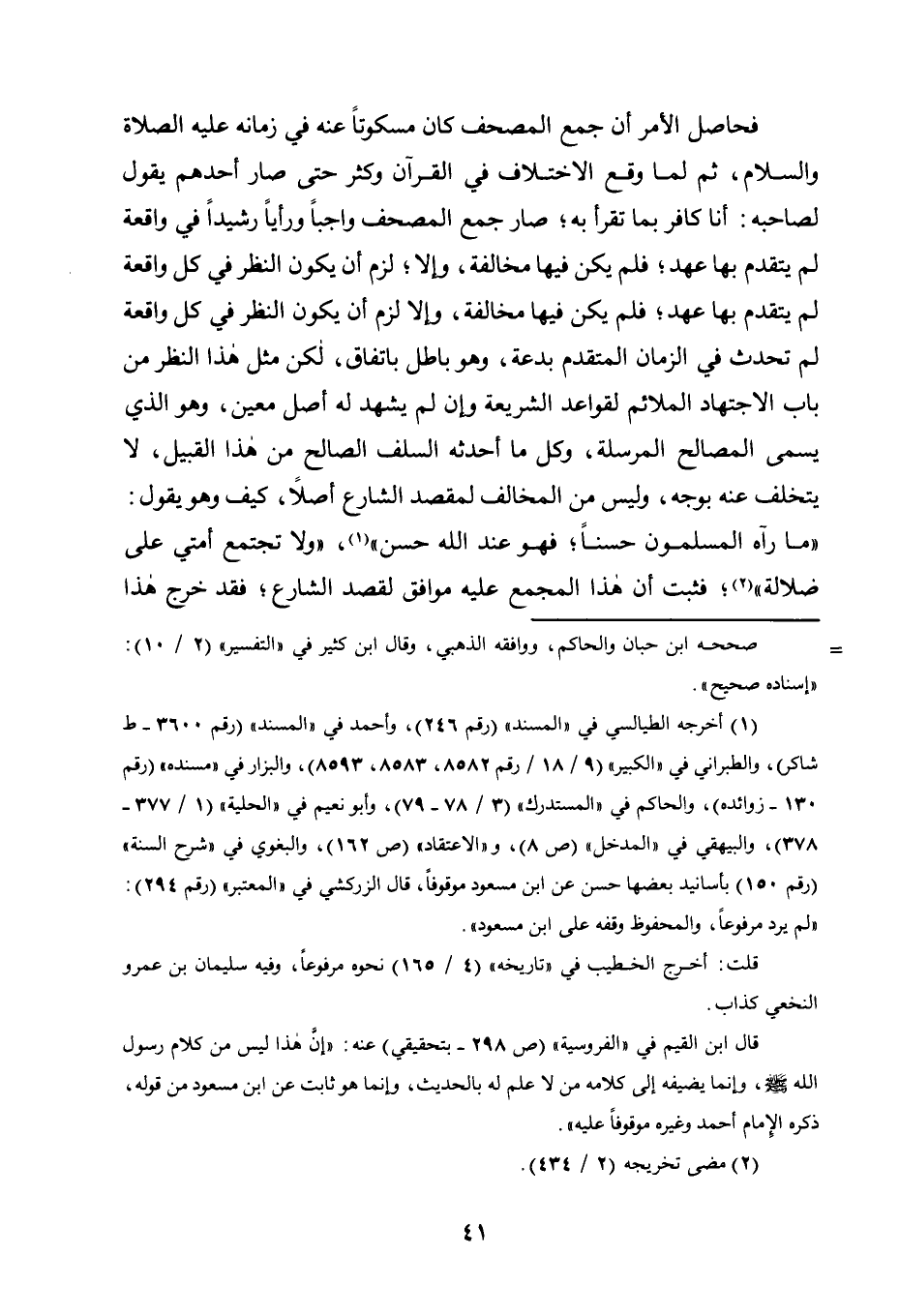 فَحَاصِلُ الْأَمْرِ أَنَّ جَمْعَ الْمُصْحَفِ كَانَ مَسْكُوتًا عَنْهُ فِي زَمَانِهِ عَلَيْهِ الصَّلَاةُ وَالسَّلَامُ، ثُمَّ لَمَّا وَقَعَ الِاخْتِلَافُ فِي الْقُرْآنِ وَكَثُرَ حَتَّى صَارَ أَحَدُهُمْ يَقُولُ لِصَاحِبِهِ: أَنَا كَافِرٌ بِمَا تَقْرَأُ بِهِ؛ صَارَ جَمْعُ الْمُصْحَفِ وَاجِبًا وَرَأَيًا رَشِيدًا فِي وَاقِعَةٍ لَمْ يَتَقَدَّمْ بِهَا عَهْدٌ؛ فَلَمْ يَكُنْ فِيهَا مُخَالَفَةٌ، وَإِلَّا لَزِمَ أَنْ يَكُونَ النَّظَرُ فِي كُلِّ وَاقِعَةٍ لَمْ تَحْدُثْ فِي الزَّمَانِ الْمُتَقَدِّمِ بِدَعَةً، وَهُوَ بَاطِلٌ بِاتِّفَاقٍ، لَكِنَّ مِثْلَ هَذَا النَّظَرِ مِنْ بَابِ الِاجْتِهَادِ الْمُلَائِمِ لِقَوَاعِدِ الشَّرِيعَةِ وَإِنْ لَمْ يَشْهَدْ لَهُ أَصْلٌ مُعَيَّنٌ، وَهُوَ الَّذِي يُسَمَّى الْمَصَالِحَ الْمُرْسَلَةَ، وَكُلُّ مَا أَحْدَثَهُ السَّلَفُ الصَّالِحُ مِنْ هَذَا الْقَبِيلِ، لَا يَتَخَلَّفُ عَنْهُ بِوَجْهٍ، وَلَيْسَ مِنَ الْمُخَالِفِ لِمَقْصِدِ الشَّارِعِ أَصْلًا، كَيْفَ وَهُوَ يَقُولُ: "مَا رَآهُ الْمُسْلِمُونَ حَسَنًا؛ فَهُوَ عِنْدَ اللَّهِ حَسَنٌ"1، "وَلَا تَجْتَمِعُ أُمَّتِي عَلَى ضَلَالَةٍ" 2؛ فَثَبَتَ أَنَّ هَذَا الْمُجْمَعَ عَلَيْهِ مُوَافِقٌ لِقَصْدِ الشَّارِعِ؛ فقد خرج هذا
