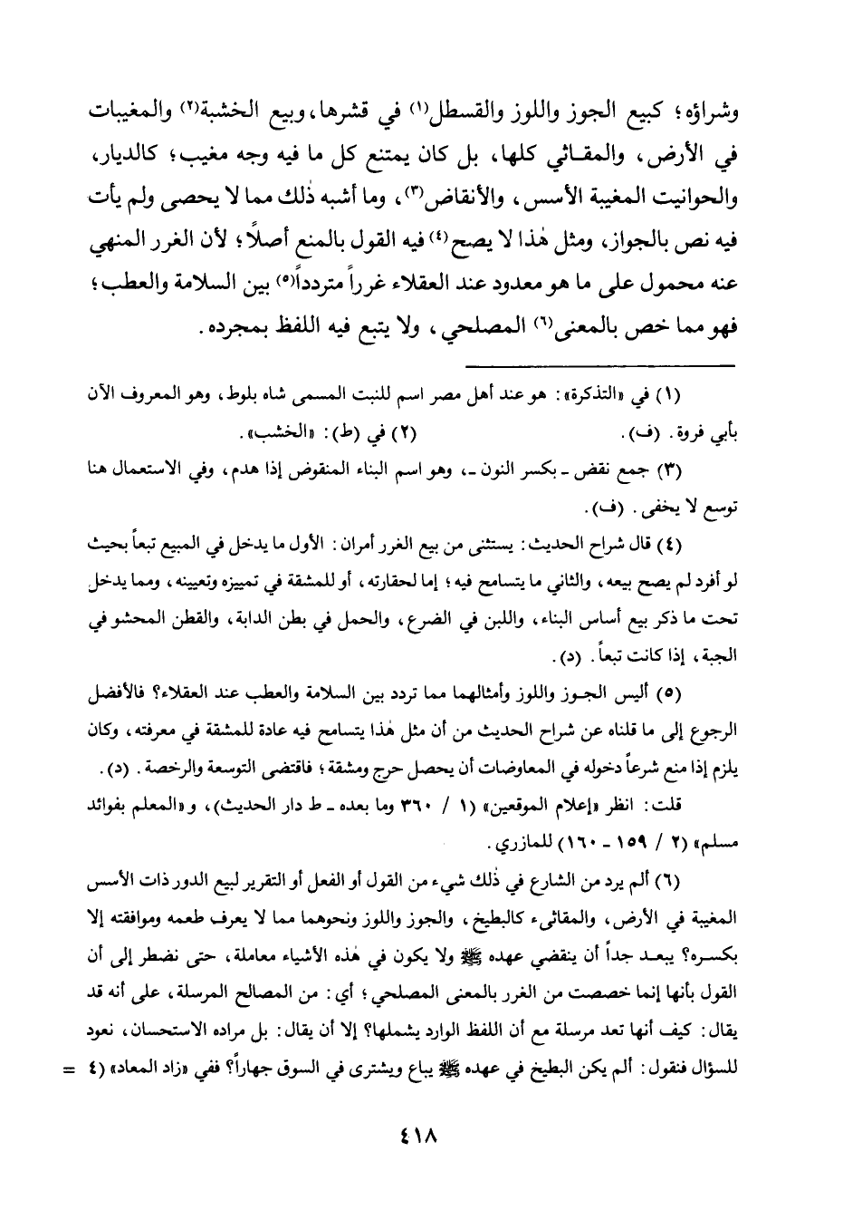 5 أليس الجوز واللوز وأمثالهما مما تردد بين السلامة والعطب عند العقلاء؟ فالأفضل الرجوع إلى ما قلناه عن شراح الحديث من أن مثل هذا يتسامح فيه عادة للمشقة في معرفته، وكان يلزم إذا منع شرعًا دخوله في المعاوضات أن يحصل حرج ومشقة؛ فاقتضى التوسعة والرخصة. "د".