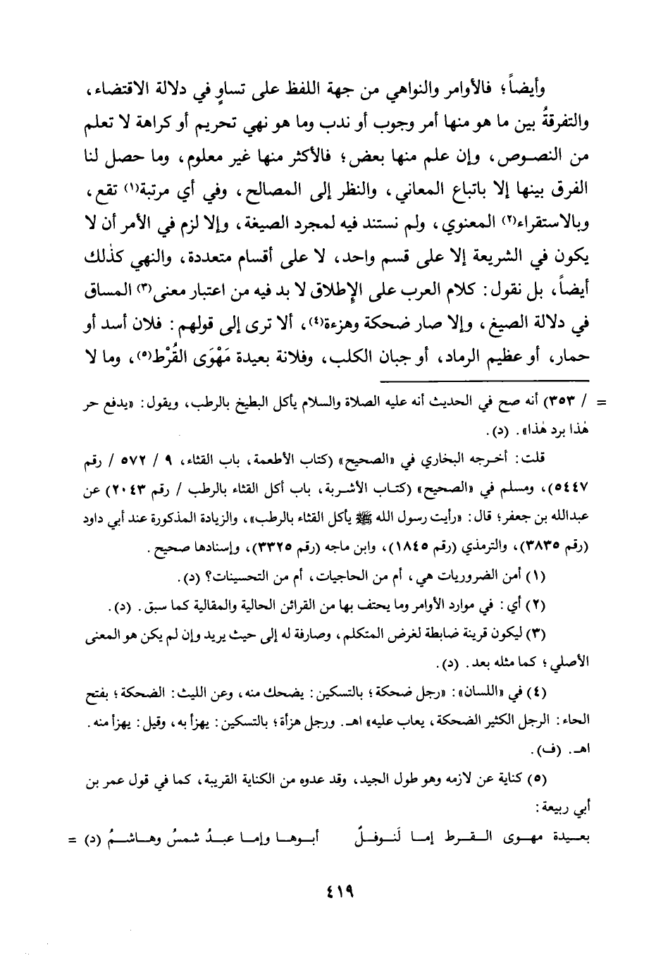 وَأَيْضًا؛ فَالْأَوَامِرُ وَالنَّوَاهِي مِنْ جِهَةِ اللَّفْظِ عَلَى تساوٍ فِي دَلَالَةِ الِاقْتِضَاءِ، وَالتَّفْرِقَةِ بَيْنَ مَا هُوَ مِنْهَا أَمْرُ وُجُوبٍ أَوْ نَدْبٍ وَمَا هُوَ نَهْيُ تَحْرِيمٍ أَوْ كَرَاهَةٍ لَا تُعْلَمُ مِنَ النُّصُوصِ، وَإِنْ عُلِمَ مِنْهَا بَعْضٌ؛ فَالْأَكْثَرُ مِنْهَا غَيْرُ مَعْلُومٍ، وَمَا حَصَلَ لَنَا الْفَرْقُ بَيْنَهَا إِلَّا بِاتِّبَاعِ الْمَعَانِي، وَالنَّظَرِ إِلَى الْمَصَالِحِ، وَفِي أَيِّ مَرْتَبَةٍ1 تَقَعُ، وَبِالِاسْتِقْرَاءِ2 الْمَعْنَوِيِّ، وَلَمْ نَسْتَنِدْ فِيهِ لِمُجَرَّدِ الصِّيغَةِ، وَإِلَّا لَزِمَ فِي الْأَمْرِ أَنْ لَا يَكُونَ فِي الشَّرِيعَةِ إِلَّا عَلَى قِسْمٍ وَاحِدٍ، لَا عَلَى أَقْسَامٍ مُتَعَدِّدَةٍ، وَالنَّهِيُ كَذَلِكَ أَيْضًا، بَلْ نَقُولُ: كَلَامُ الْعَرَبِ عَلَى الْإِطْلَاقِ لَا بُدَّ فِيهِ مِنِ اعْتِبَارِ مَعْنَى3 الْمُسَاقِ فِي دَلَالَةِ الصِّيَغِ، وَإِلَّا صَارَ ضحكة وهزءة4، أَلَا تَرَى إِلَى قَوْلِهِمْ: فُلَانٌ أَسَدٌ أَوْ حِمَارٌ، أَوْ عَظِيمُ الرَّمَادِ، أَوْ جَبَانُ الْكَلْبِ، وفلانة بعيدة مهوى القرط5، وما لا