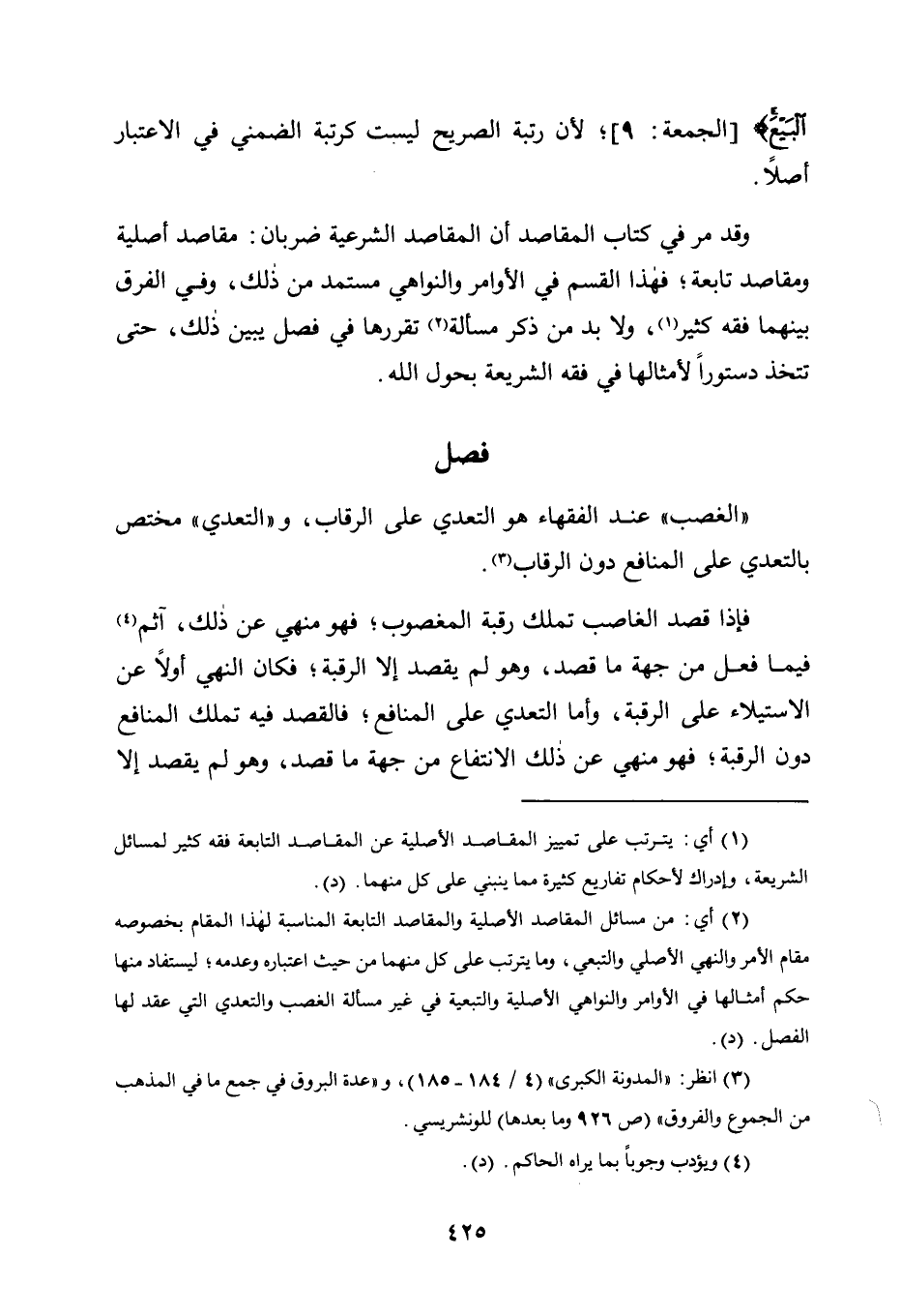 فَإِذَا قَصَدَ الْغَاصِبُ تَمَلُّكَ رَقَبَةِ الْمَغْصُوبِ؛ فَهُوَ مَنْهِيٌّ عَنْ ذَلِكَ، آثِمٌ4 فِيمَا فَعَلَ مِنْ جِهَةِ مَا قَصَدَ، وَهُوَ لَمْ يَقْصِدْ إِلَّا الرَّقَبَةَ؛ فَكَانَ النَّهْيُ أَوَّلًا عَنِ الِاسْتِيلَاءِ عَلَى الرَّقَبَةِ، وَأَمَّا التَّعَدِّي عَلَى الْمَنَافِعِ؛ فَالْقَصْدُ فِيهِ تَمَلُّكُ الْمَنَافِعِ دُونَ الرَّقَبَةِ؛ فَهُوَ مَنْهِيٌّ عَنْ ذَلِكَ الِانْتِفَاعِ مِنْ جِهَةِ مَا قَصَدَ، وَهُوَ لَمْ يقصد إلا