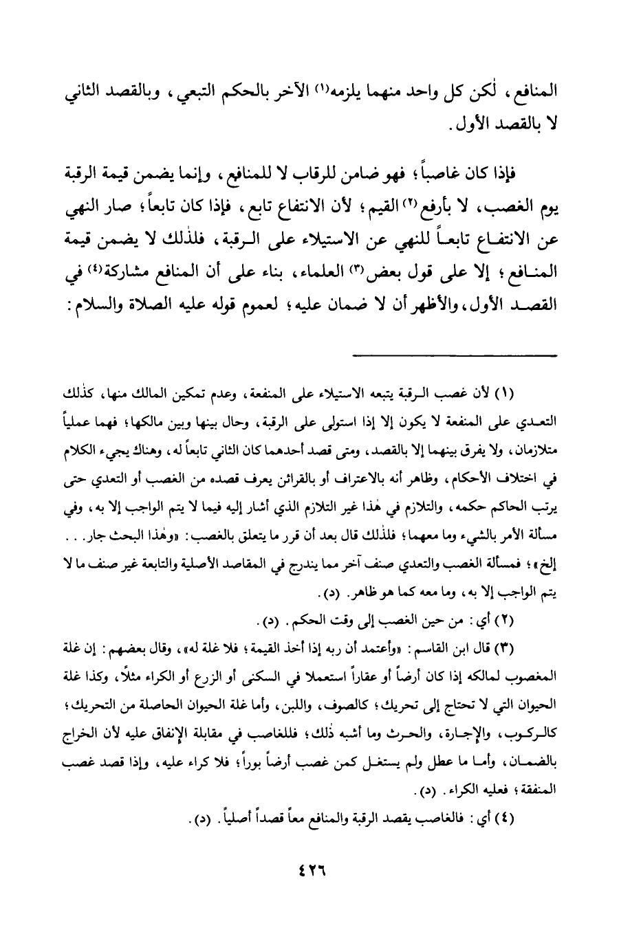 4 أي: فالغاضب يقصد الرقبة والمنافع معًا قصدًا أصليًا. "د".