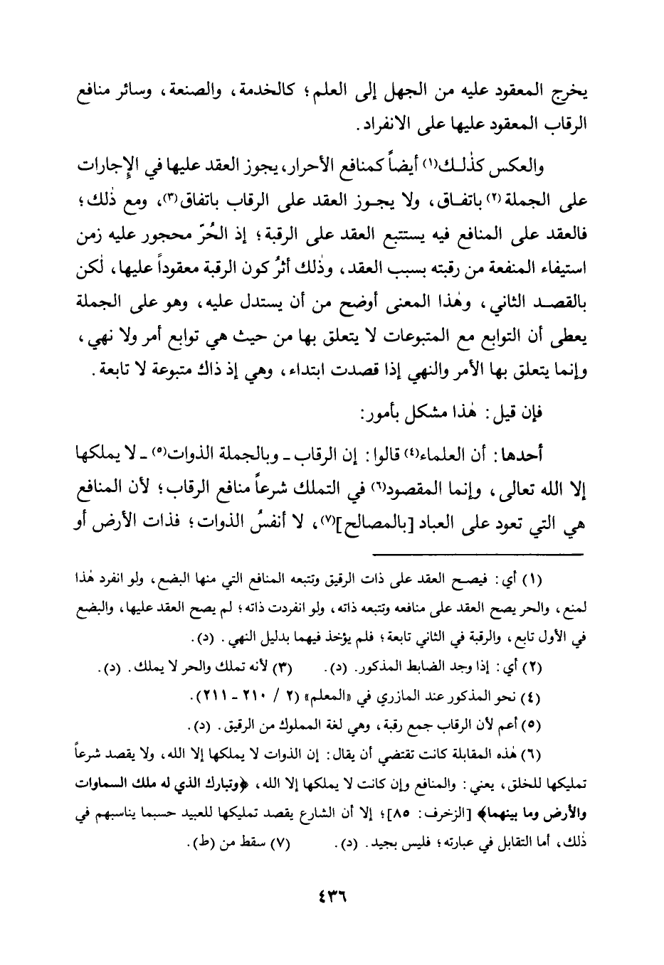 6 هذه المقابلة كانت تقتضي أن يقال: إن الذوات لا يملكها إلا الله، ولا يقصد شرعًا تمليكها للخلق، يعني: والمنافع وإن كانت لا يملكها إلا الله، {وَتَبَارَكَ الَّذِي لَهُ مُلْكُ السَّمَاوَاتِ وَالْأَرْضِ وَمَا بَيْنَهُمَا} [الزخرف: 85] ؛ إلا أن الشارع يقصد تمليكها للعبيد حسبما يناسبهم في ذلك، أما التقابل في عبارته؛! فليس بجيد. "د".