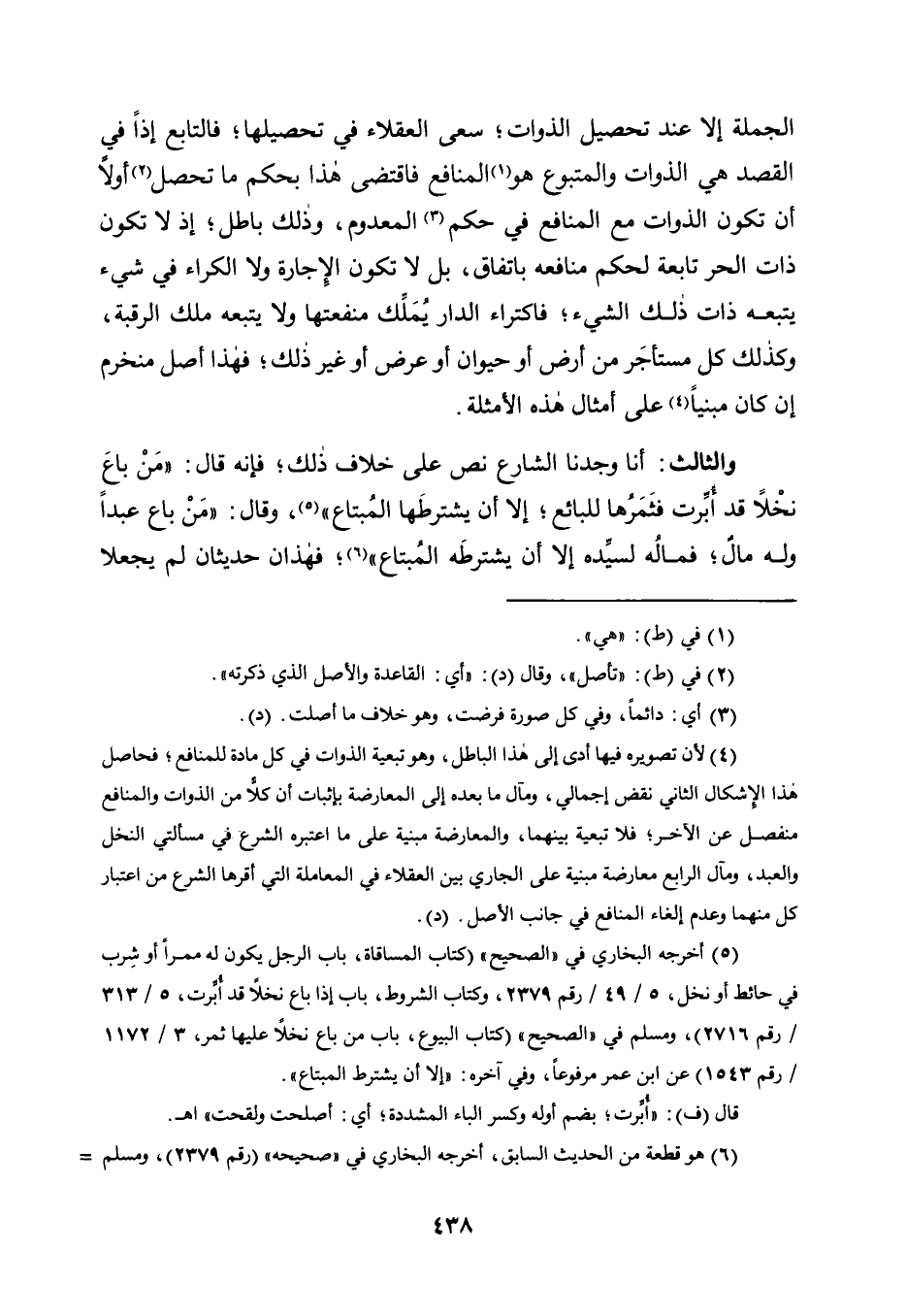 4 لأن تصويره فيها أدى إلى هذا الباطل، وهو تبعية الذوات في كل مادة للمنافع؛ فحاصل هذا الإشكال الثاني نقض إجمالي، ومآل ما بعده إلى المعارضة بإثبات أن كلًّا من الذوات والمنافع منفصل عن الآخر؛ فلا تبعية بينهما، والمعارضة مبنية على ما اعتبره الشرع في مسألتي النخل والعبد، ومآل الرابع معارضة مبنية على الجاري بين العقلاء في المعاملة التي أقرها الشرع من اعتبار كل منهما وعدم إلغاء المنافع في جانب الأصل. "د".