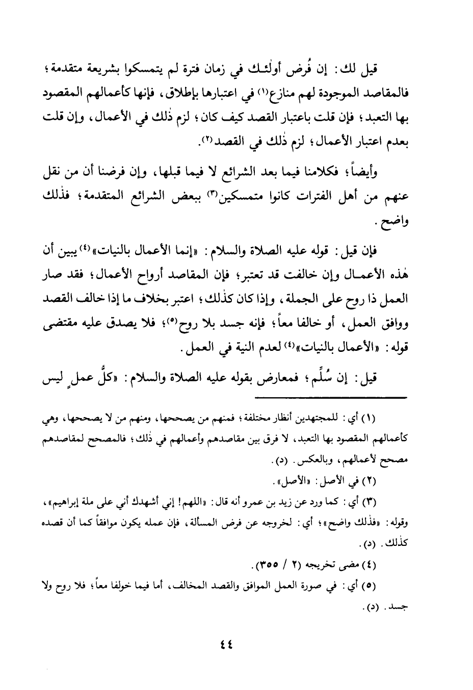 قِيلَ لَكَ: إِنْ فُرض أُولَئِكَ فِي زَمَانِ فَتْرَةٍ لَمْ يَتَمَسَّكُوا بِشَرِيعَةٍ مُتَقَدِّمَةٍ؛ فَالْمَقَاصِدُ الْمَوْجُودَةُ لَهُمْ مَنَازِعُ1 فِي اعْتِبَارِهَا بِإِطْلَاقٍ، فَإِنَّهَا كَأَعْمَالِهِمُ الْمَقْصُودِ بِهَا التَّعَبُّدُ؛ فَإِنْ قُلْتَ بِاعْتِبَارِ الْقَصْدِ كَيْفَ كَانَ؛ لَزِمَ ذَلِكَ فِي الْأَعْمَالِ، وَإِنْ قُلْتَ بِعَدَمِ اعْتِبَارِ الْأَعْمَالِ؛ لَزِمَ ذَلِكَ فِي القصد2.
