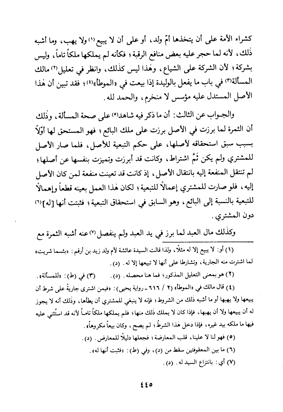كَشِرَاءِ الْأَمَةِ عَلَى أَنْ يَتَّخِذَهَا أُمَّ وَلَدٍ، أَوْ عَلَى أَنْ لَا يَبِيعَ1 وَلَا يَهَبَ، وَمَا أَشْبَهَ ذَلِكَ، لِأَنَّهُ لَمَّا حَجَرَ عَلَيْهِ بَعْضَ مَنَافِعِ الرَّقَبَةِ؛ فَكَأَنَّهُ لَمْ يَمْلُكْهَا مِلْكًا تَامًّا، وَلَيْسَ بِشَرِكَةٍ؛ لِأَنَّ الشَّرِكَةَ عَلَى الشِّيَاعِ، وَهَذَا لَيْسَ كَذَلِكَ، وَانْظُرْ فِي تَعْلِيلِ2 مَالِكٍ الْمَسْأَلَةَ3 فِي بَابِ مَا يُفْعَلُ بِالْوَلِيدَةِ إِذَا بِيعَتْ فِي "الْمُوَطَّأِ"4؛ فَقَدْ تَبَيَّنَ أَنَّ هَذَا الْأَصْلَ الْمُسْتَدَلَّ عَلَيْهِ مُؤَسِّسٌ لَا مُنْخَرِمٌ، وَالْحَمْدُ لِلَّهِ.