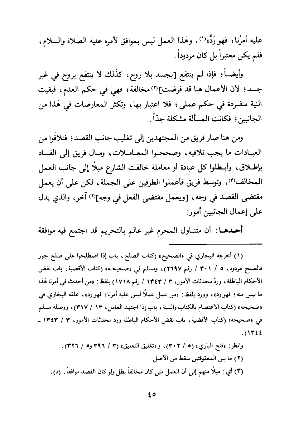 وَمِنْ هُنَا صَارَ فَرِيقٌ مِنَ الْمُجْتَهِدِينَ إِلَى تَغْلِيبِ جَانِبِ الْقَصْدِ؛ فَتَلَافَوْا مِنَ الْعِبَادَاتِ مَا يَجِبُ تَلَافِيهِ، وَصَحَّحُوا الْمُعَامَلَاتِ، وَمَالَ فَرِيقٌ إِلَى الْفَسَادِ بِإِطْلَاقٍ، وَأَبْطَلُوا كُلَّ عِبَادَةٍ أَوْ مُعَامَلَةٍ خَالَفَتِ الشَّارِعَ مَيْلًا إِلَى جَانِبِ الْعَمَلِ الْمُخَالِفِ3، وَتَوَسَّطَ فَرِيقٌ فَأَعْمَلُوا الطَّرَفَيْنِ عَلَى الْجُمْلَةِ، لَكِنْ عَلَى أَنْ يُعْمَلَ مُقْتَضَى الْقَصْدِ فِي وَجْهٍ، [وَيُعْمَلُ مُقْتَضَى الْفِعْلِ فِي وَجْهٍ] 2 آخَرَ، وَالَّذِي يَدُلُّ عَلَى إعمال الجانبيين أُمُورٌ: