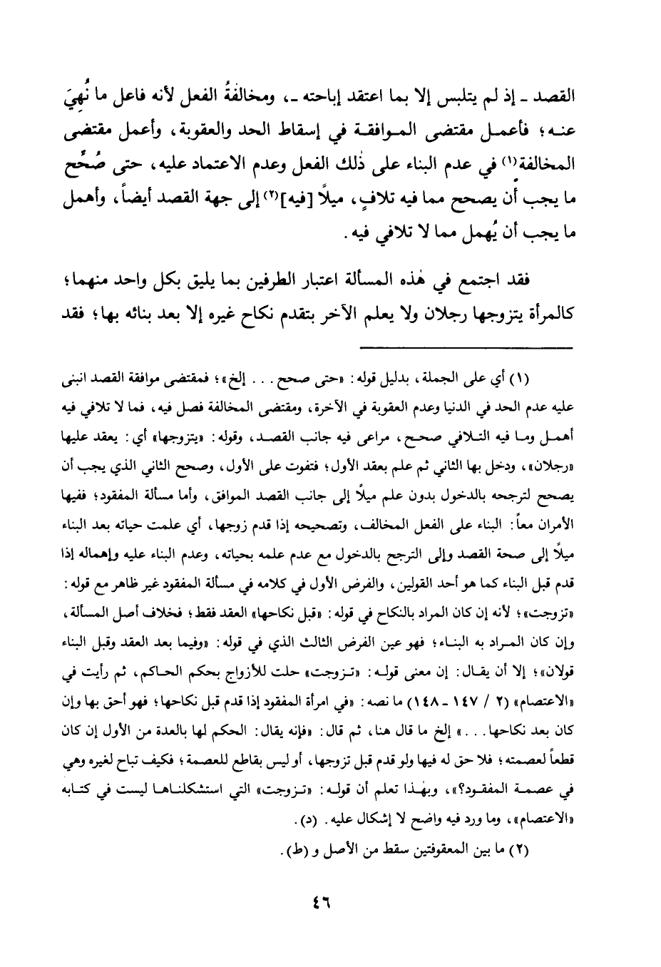 1 أي على الجملة، بدليل قوله: "حتى صحح ... إلخ"؛ فمقتضى موافقة القصد انبنى عليه عدم الحد في الدنيا وعدم العقوبة في الآخرة، ومقتضى المخالفة فصل فيه، فما لا تلافي فيه أهمل وما فيه التلافي صحح، مراعى فيه جانب القصد، وقوله: "يتزوجها" أي: يعقد عليها "رجلان"، ودخل بها الثاني ثم علم بعقد الأول؛ فتفوت على الأول، وصحح الثاني الذي يجب أن يصحح لترجحه بالدخول بدون علم ميلا إلى جانب القصد الموافق، وأما مسألة المفقود؛ ففيها الأمران معًا: البناء على الفعل المخالف، وتصحيحه إذا قدم زوجها، أي علمت حياته بعد البناء ميلاً إلى صحة القصد وإلى الترجح بالدخول مع عدم علمه بحياته، وعدم البناء عليه وإهماله إذا قدم قبل البناء كما هو أحد القولين، والفرض الأول في كلامه في مسألة المفقود غير ظاهر مع قوله: "تزوجت"؛ لأنه إن كان المراد بالنكاح في قوله: "قبل نكاحها" العقد فقط؛ فخلاف أصل المسألة، وإن كان المراد به البناء؛ فهو عين الفرض الثالث الذي في قوله: "وفيما بعد العقد وقبل البناء قولان"؛ إلا أن يقال: إن معنى قوله: "تزوجت" حلت للأزواج بحكم الحاكم، ثم رأيت في "الاعتصام" "2/ 147-148" ما نصه: "في امرأة المفقود إذا قدم قبل نكاحها؛ فهو أحق بها وإن كان بعد نكاحها ... " إلخ ما قال هنا، ثم قال: "فإنه يقال: الحكم لها بالعدة من الأول إن كان قطعا لعصمته؛ فلا حق له فيها ولو قدم قبل تزوجها، أو ليس بقاطع للعصمة؛ فكيف تباح لغيره وهي في عصمة المفقود؟ "، وبهذا تعلم أن قوله: "تزوجت" التي استشكلناها ليست في كتابه "الاعتصام"، وما ورد فيه واضح لا إشكال عليه. "د".