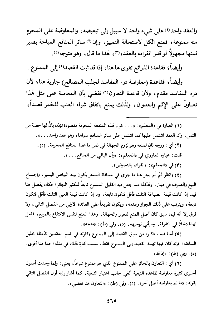 وَأَيْضًا فَقَاعِدَةُ "مُعَارَضَةِ دَرْءِ الْمَفَاسِدِ لِجَلْبِ الْمَصَالِحِ" جَارِيَةٌ هُنَا؛ لِأَنَّ دَرْءَ الْمَفَاسِدِ مُقَدَّمٌ، وَلِأَنَّ قَاعِدَةَ التعاون6 تَقْضِي بِأَنَّ الْمُعَامَلَةَ عَلَى مِثْلِ هَذَا تَعَاوُنٌ عَلَى الْإِثْمِ وَالْعُدْوَانِ، وَلِذَلِكَ يُمْنَعُ بِاتِّفَاقٍ شِرَاءُ العنب للخمر قصدًا،