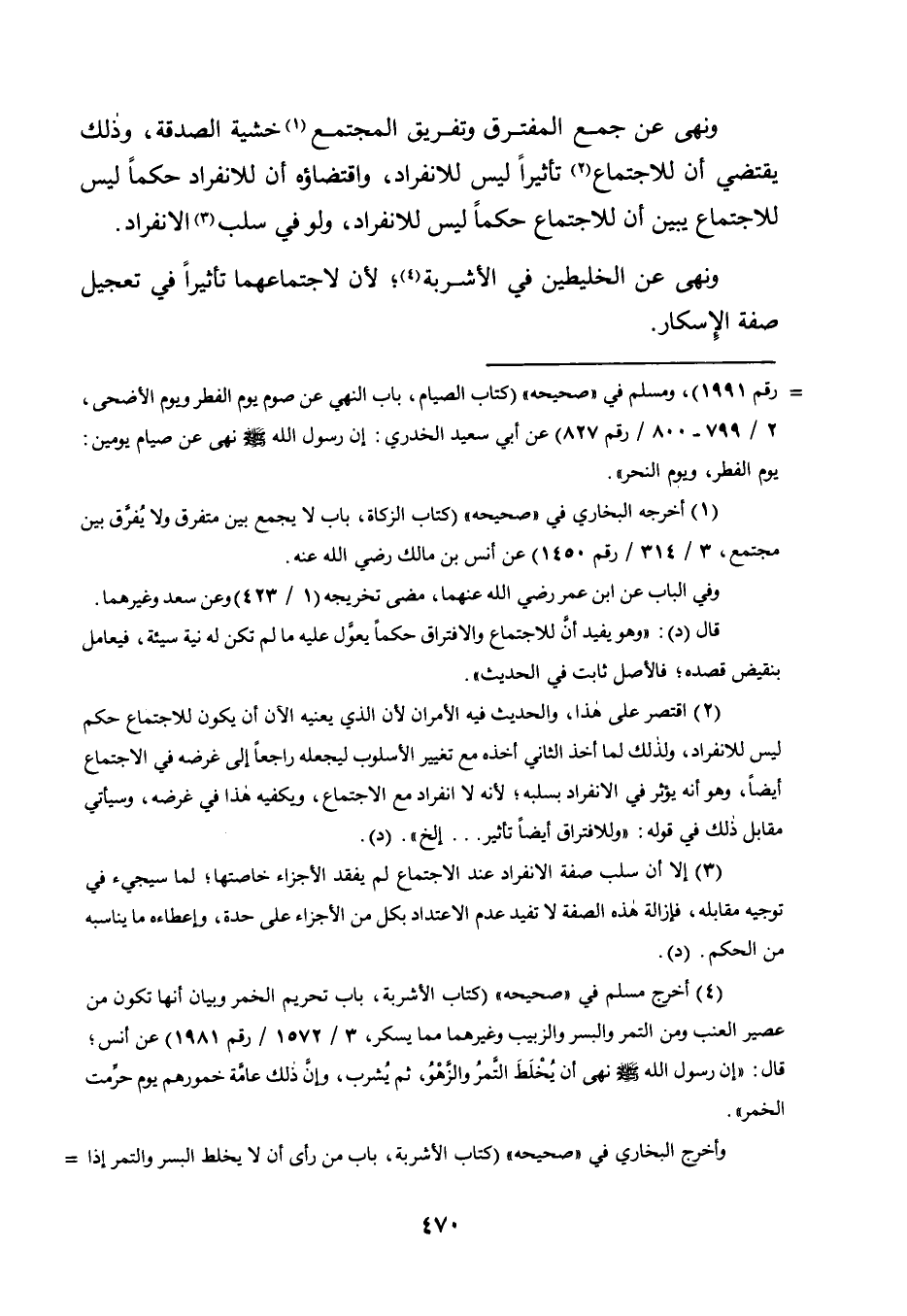 وَنَهَى عَنْ جَمْعِ الْمُفْتَرِقِ وَتَفْرِيقِ الْمُجْتَمِعِ1 خَشْيَةَ الصَّدَقَةِ، وَذَلِكَ يَقْتَضِي أَنَّ لِلِاجْتِمَاعِ2 تَأْثِيرًا لَيْسَ لِلِانْفِرَادِ، وَاقْتِضَاؤُهُ أَنَّ لِلِانْفِرَادِ حُكْمًا لَيْسَ لِلِاجْتِمَاعِ يُبَيِّنُ أَنَّ لِلِاجْتِمَاعِ حُكْمًا لَيْسَ لِلِانْفِرَادِ، وَلَوْ فِي سَلْبِ3 الِانْفِرَادِ.