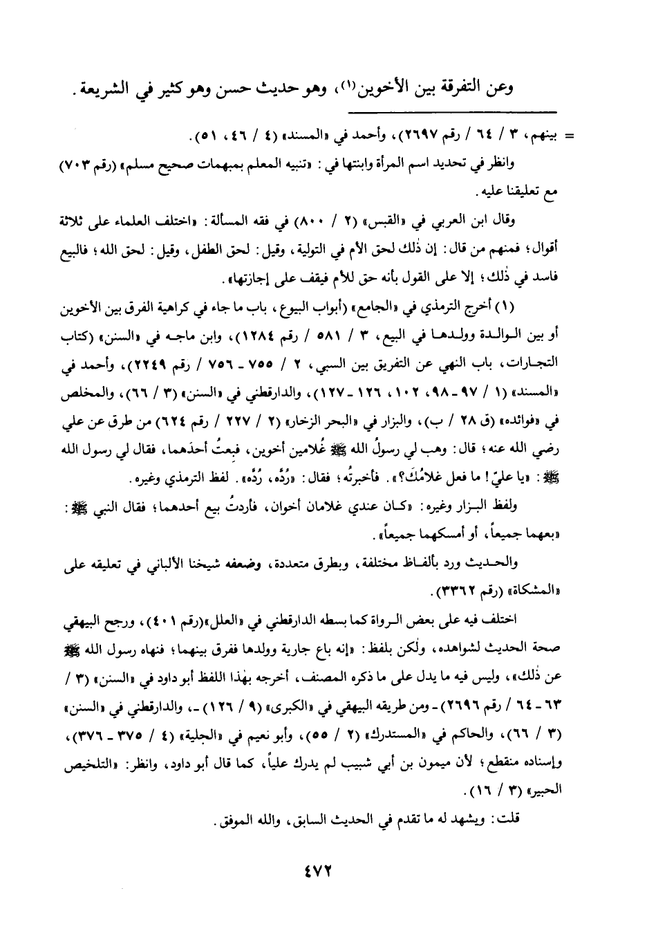 1 أخرج الترمذي في "الجامع" "أبواب البيوع، باب ما جاء في كراهية الفرق بين الأخوين أو بين الوالدة وولدها في البيع، 3/ 581/ رقم 1284"، وابن ماجه في "السنن" "كتاب التجارات، باب النهي عن التفريق بين السبي، 2/ 755-756/ رقم 2249"، وأحمد في "المسند" "1/ 97-98، 102، 126-127"، والدارقطني في "السنن" "3/ 66"، والمخلص في "فوائده" "ق28/ ب"، والبزار في "البحر الزخار" "2/ 227/ رقم 624" من طرق عن علي رضي الله عنه؛ قال: وهب لي رسول الله صلى الله عليه وسلم غلامين أخوين، فبعت أحدهما، فقال لي رسول الله صلى الله عليه وسلم: "يا علي! ما فعل غلامك؟ ". فأخبرته؛ فقال: "رده، رده". لفظ الترمذي وغيره.