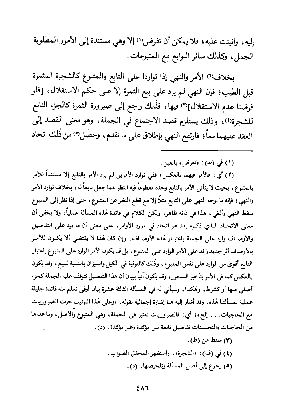 2 أي: فالأمر فيهما بالعكس؛ ففي توارد الأمرين لم يرد الأمر بالتابع إلا مستندًا للأمر بالمتبوع، بحيث لا يتأتى الأمر بالتابع وحده مقطوعًا فيه النظر عما جعل تابعًا له، بخلاف توارد الأمر والنهي؛ فإنه ما توجه النهي على التابع مثلا إلا مع قطع النظر عن المتبوع، حتى إذا نظر إلى المتبوع سقط النهي وأُلغي، هذا في ذاته ظاهر، ولكن الكلام في فائدة هذه المسألة عمليًّا، ولا يخفى أن معنى الاتحاد الذي ذكره بعد هو اتحاد في مورد الأوامر، على معنى أن ما يرد على التفاصيل والأوصاف وارد على الجملة باعتبار هذه الأوصاف، وإن كان هذا لا يقتضي ألا يكون للأمر بالأوصاف أثر جديد زائد على الأمر الوارد على المتبوع باعتبار التابع أقوى من الوارد على نفس المتبوع، وذلك كالتوفية في الكيل والميزان بالنسبة للبيع، وقد يكون بالعكس كما في الأمر بتأخير السحور، وقد يكون آتيًا ببيان أن هذا التفصيل تتوقف عليه الجملة كجزء أصلي منها أو كشرط، وهكذا، وسيأتي له في المسألة الثالثة عشرة بيان أوفى تعلم منه فائدة جليلة عملية لمسألتنا هذه، وقد أشار إليه هنا إشارة إجمالية بقوله: "وعلى هذا الترتيب جرت الضروريات مع الحاجيات ... إلخ"؛ أي: فالضروريات تعتبر هي الجملة، وهي المتبوع والأصل، وما عداها من الحاجيات والتحسينات تفاصيل تابعة بين مؤكدة وغير مؤكدة. "د".