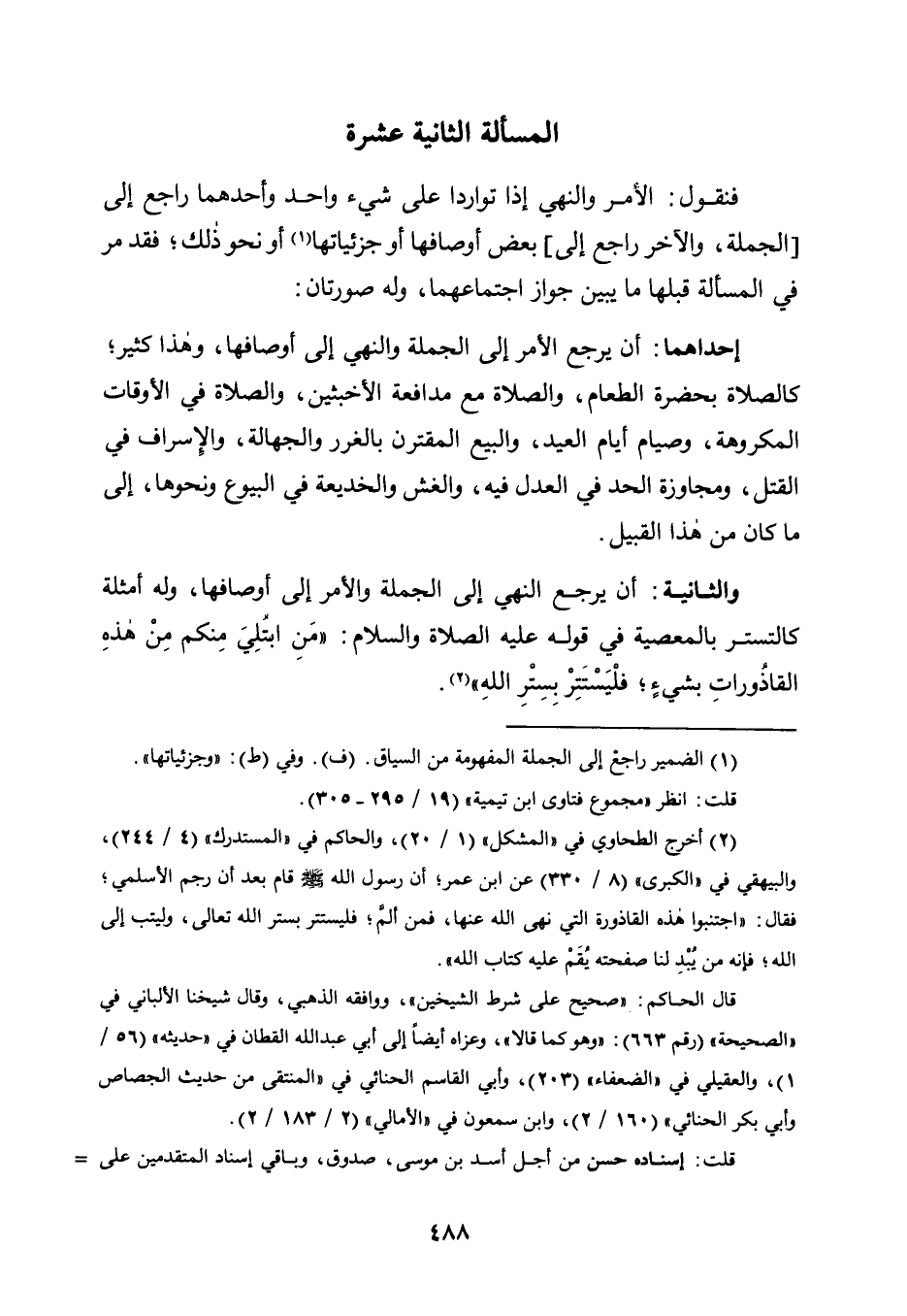 وَالثَّانِيَةُ: أَنْ يَرْجِعَ النَّهْيُ إِلَى الْجُمْلَةِ وَالْأَمْرُ إِلَى أَوْصَافِهَا، وَلَهُ أَمْثِلَةٌ كَالتَّسَتُّرِ بِالْمَعْصِيَةِ فِي قَوْلِهِ عَلَيْهِ الصَّلَاةُ وَالسَّلَامُ: "مَنِ ابْتُلِيَ مِنْكُمْ مِنْ هَذِهِ الْقَاذُورَاتِ بِشَيْءٍ؛ فَلْيَسْتَتِرْ بِسِتْرِ اللَّهِ" 2.