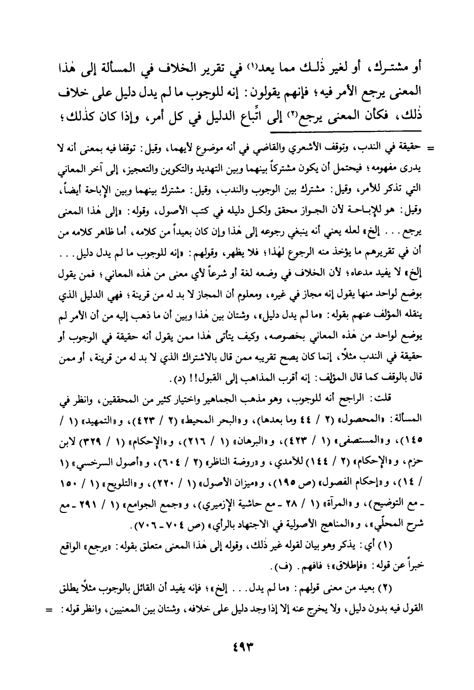 2 بعيد من معنى قولهم: "مالم يدل ... إلخ"؛ فإنه يفيد أن القائل بالوجوب مثلا يطلق القول فيه بدون دليل، ولا يخرج عنه إلا إذا وجد دليل على خلافه، وشتان بين المعنيين، وانظر قوله: "لكن إطلاق القول فيما لم يظهر دليله صعب" الذي يفيد أنهم يطلقونه مع عدم الدليل؛ فلا يتم رجوع كلامهم إلى ما ذكره. "د".