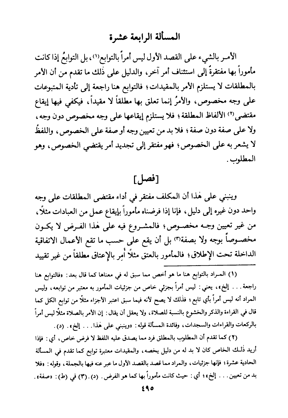 1 المراد بالتوابع هنا ما هو أخص مما سبق له في معناها كما قال بعد: "فالتوابع هنا راجعة ... إلخ" يعني: ليس أمرًا بجزئي خاص من جزئيات المأمور به معتبر من توابعه، وليس المراد أنه ليس أمرًا بأي تابع؛ فذلك لا يصح لأنه فيما سبق اعتبر الأجزاء مثلًا من توابع الكل كما قال في القراءة والذكر والخشوع بالنسبة للصلاة، ولا يعقل أن يقال: إن الأمر بالصلاة مثلا ليس أمرًا بالركعات والقراءات والسجدات، وفائدة المسألة قوله: "وينبني على هذا ... إلخ". "د".