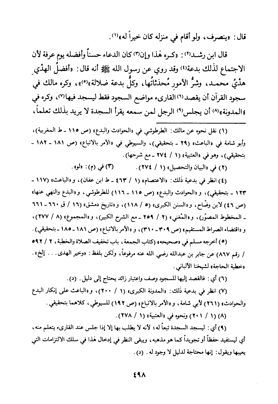 قَالَ ابْنُ رُشْدٍ2: "كَرِهَ هَذَا وَإِنْ3 كَانَ الدُّعَاءُ حَسَنًا وَأَفْضَلُهُ يَوْمَ عَرَفَةَ لِأَنَّ الِاجْتِمَاعَ لِذَلِكَ بِدْعَةٌ4 وَقَدْ رُوي عَنْ رَسُولِ اللَّهِ صَلَّى اللَّهُ عَلَيْهِ وَسَلَّمَ أَنَّهُ قَالَ: "أفضلُ الهدْي هدْيُ مُحَمَّدٍ، وشرُّ الْأُمُورِ مُحدَثاتُها، وكلُّ بِدْعَةٍ ضَلَالَةٌ" 5" وَكَرِهَ مَالِكٌ فِي سُجُودِ الْقُرْآنِ أَنْ يَقْصِدَ6 الْقَارِئُ مَوَاضِعَ السُّجُودِ فَقَطْ لِيَسْجُدَ فِيهَا7، وَكَرِهَ فِي "الْمُدَوَّنَةِ"8 أَنْ يَجْلِسَ9 الرِّجْلُ لِمَنْ سَمِعَهُ يَقْرَأُ السَّجْدَةَ لَا يريد بذلك تعلمًا