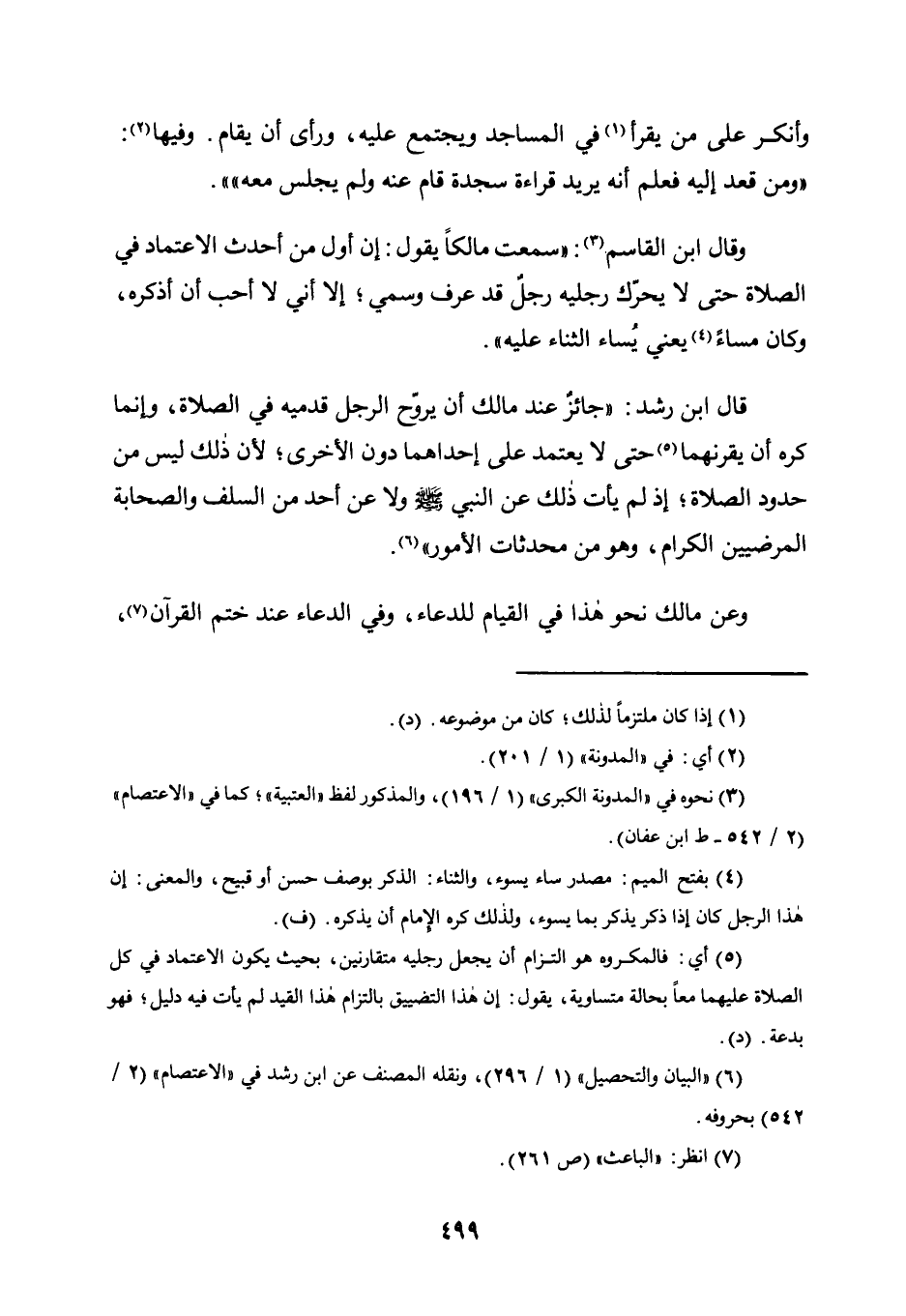 وَقَالَ ابْنُ الْقَاسِمِ3: "سَمِعْتُ مَالِكًا يَقُولُ: إِنَّ أَوَّلَ مَنْ أَحْدَثَ الِاعْتِمَادَ فِي الصَّلَاةِ حَتَّى لَا يُحَرِّكَ رِجْلَيْهِ قَدْ عُرِفَ وَسُمِّىَ؛ إِلَّا أَنِّي لَا أُحِبُّ أَنْ أَذْكُرَهُ، وَكَانَ مَسَاءً4 يَعْنِي يُساء الثَّنَاءَ عَلَيْهِ".