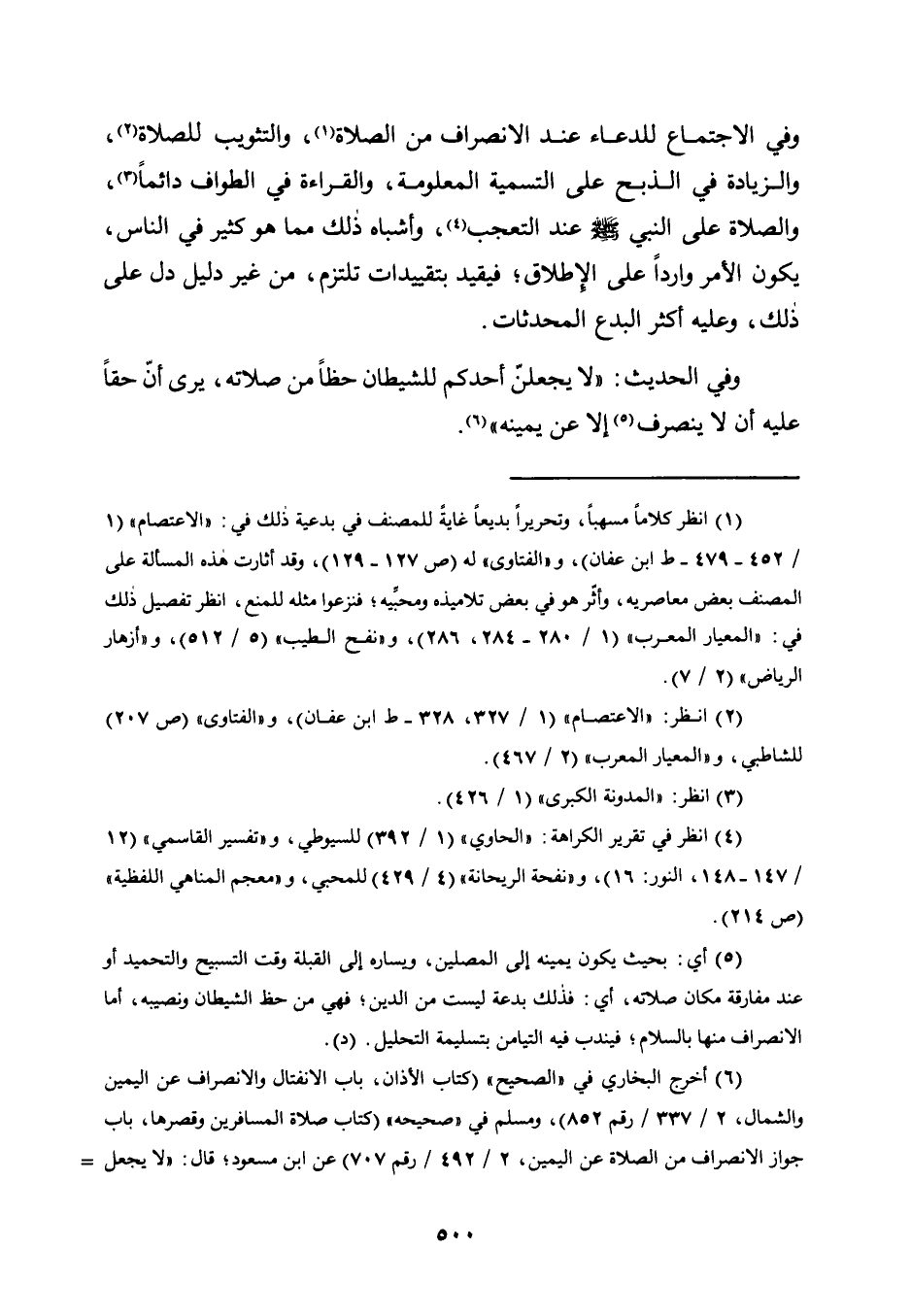 5 أي: بحيث يكون يمينه إلى المصلين، ويساره إلى القبلة وقت التسبيح والتحميد أو عند مفارقة مكان صلاته، أي: فذلك بدعة ليست من الدين؛ فهي من حظ الشيطان ونصيبه، أما الانصراف منها بالسلام؛ فيندب فيه التيامن بتسليمة التحليل. "د".