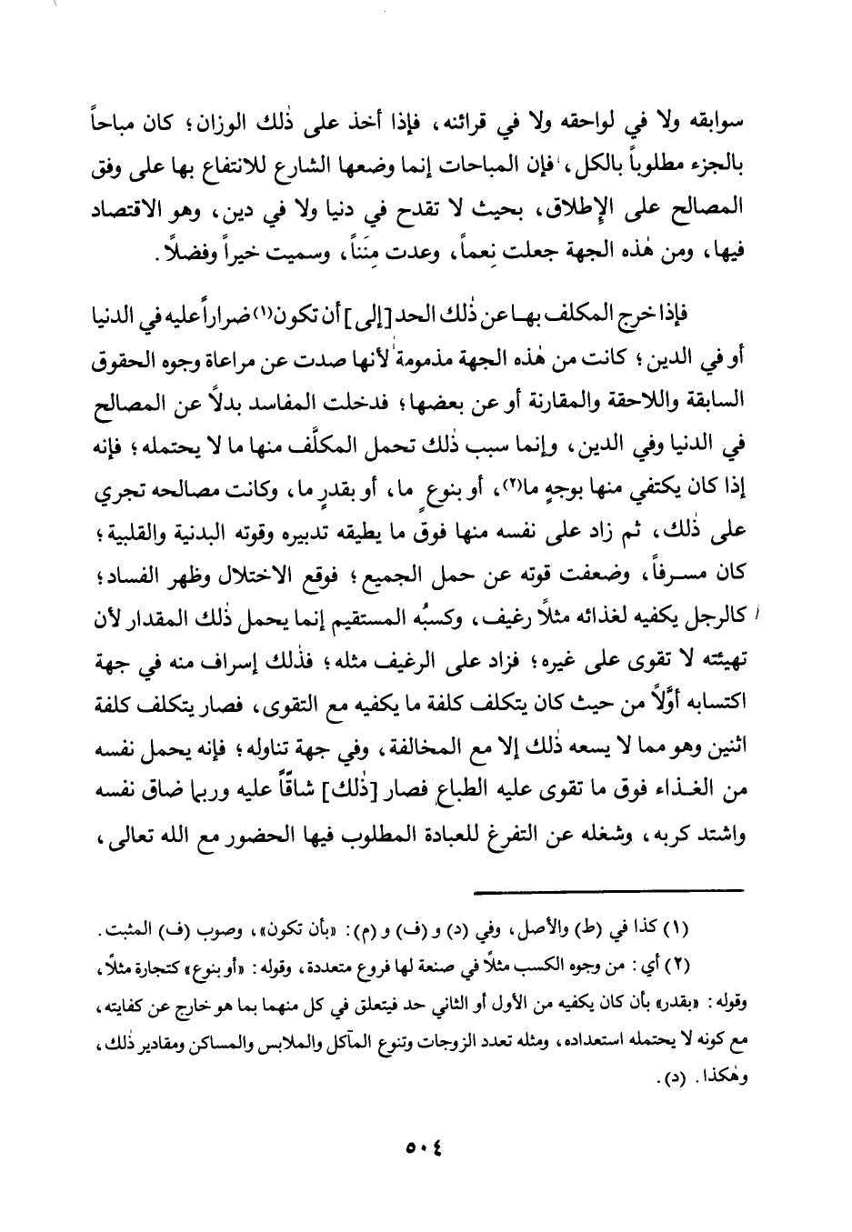 فَإِذَا خَرَجَ الْمُكَلَّفُ بِهَا عَنْ ذَلِكَ الحد [إلى] أن تكون1 ضرارًا عَلَيْهِ فِي الدُّنْيَا أَوْ فِي الدِّينِ؛ كَانَتْ مِنْ هَذِهِ الْجِهَةِ مَذْمُومَةً لِأَنَّهَا صَدَّتْ عَنْ مُرَاعَاةِ وُجُوهِ الْحُقُوقِ السَّابِقَةِ وَاللَّاحِقَةِ وَالْمُقَارِنَةِ أَوْ عَنْ بَعْضِهَا؛ فَدَخَلَتِ الْمَفَاسِدُ بَدَلًا عَنِ الْمَصَالِحِ فِي الدُّنْيَا وَفِي الدِّينِ، وَإِنَّمَا سَبَبُ ذَلِكَ تَحَمُّلُ الْمُكَلَّفِ مِنْهَا مَا لَا يَحْتَمِلُهُ؛ فَإِنَّهُ إِذَا كَانَ يَكْتَفِي مِنْهَا بِوَجْهٍ مَا2، أَوْ بِنَوْعٍ مَا، أَوْ بِقَدْرٍ مَا، وَكَانَتْ مَصَالِحُهُ تُجْرَى عَلَى ذَلِكَ، ثُمَّ زَادَ عَلَى نَفْسِهِ مِنْهَا فَوْقَ مَا يُطِيقُهُ تَدْبِيرُهُ وَقُوَّتُهُ الْبَدَنِيَّةُ وَالْقَلْبِيَّةُ؛ كَانَ مُسْرِفًا، وَضَعُفَتْ قُوَّتُهُ عَنْ حَمْلِ الْجَمِيعِ؛ فَوَقَعَ الِاخْتِلَالُ وَظَهَرَ الْفَسَادُ؛ كَالرَّجُلِ يَكْفِيهِ لِغِذَائِهِ مَثَلًا رَغِيفٌ، وَكَسْبُهُ الْمُسْتَقِيمُ إِنَّمَا يَحْمِلُ ذَلِكَ الْمِقْدَارَ لِأَنَّ تَهْيِئَتَهُ لَا تَقْوَى عَلَى غَيْرِهِ؛ فَزَادَ عَلَى الرَّغِيفِ مِثْلَهُ؛ فَذَلِكَ إِسْرَافٌ مِنْهُ فِي جِهَةِ اكْتِسَابِهِ أَوَّلًا مِنْ حَيْثُ كَانَ يَتَكَلَّفُ كُلْفَةَ مَا يَكْفِيهِ مَعَ التَّقْوَى، فَصَارَ يَتَكَلَّفُ كُلْفَةَ اثْنَيْنِ وَهُوَ مِمَّا لَا يَسَعُهُ ذَلِكَ إِلَّا مَعَ الْمُخَالَفَةِ، وَفِي جِهَةِ تَنَاوُلِهِ؛ فَإِنَّهُ يَحْمِلُ نَفْسَهُ مِنَ الْغِذَاءِ فَوْقَ مَا تَقْوَى عَلَيْهِ الطِّبَاعُ فَصَارَ [ذَلِكَ] شَاقًّا عَلَيْهِ وَرُبَّمَا ضَاقَ نَفْسُهُ وَاشْتَدَّ كَرْبُهُ، وَشَغَلَهُ عَنِ التَّفَرُّغِ لِلْعِبَادَةِ الْمَطْلُوبِ فِيهَا الْحُضُورُ مَعَ الله تعالى،
