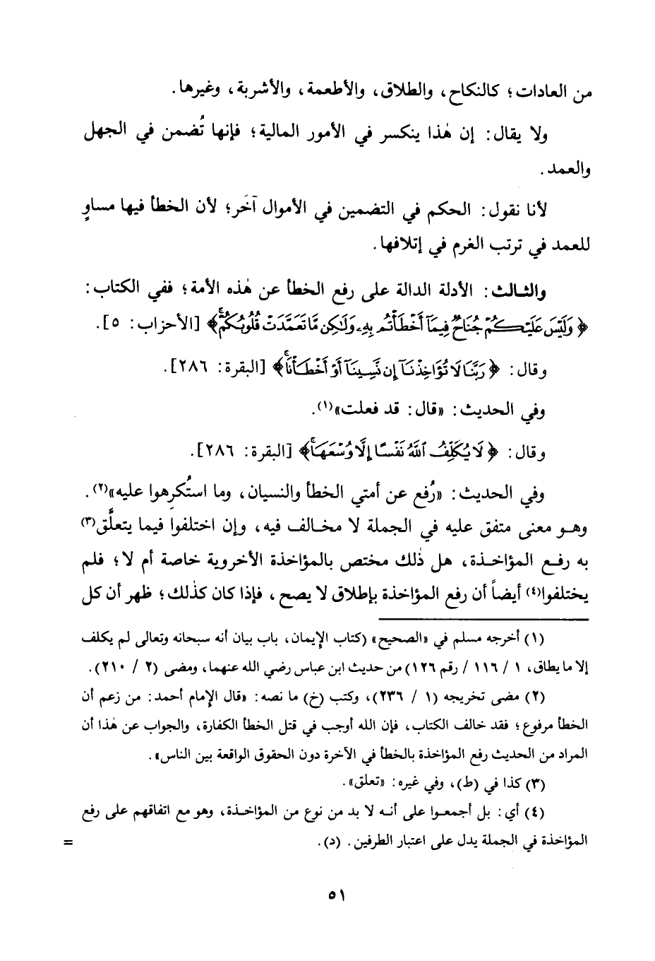 الْأَدِلَّةُ الدَّالَّةُ عَلَى رَفْعِ الْخَطَأِ عَنْ هَذِهِ الْأُمَّةِ؛ فَفِي الْكِتَابِ: {وَلَيْسَ عَلَيْكُمْ جُنَاحٌ فِيمَا أَخْطَأْتُمْ بِهِ وَلَكِنْ مَا تَعَمَّدَتْ قُلُوبُكُمْ} [الْأَحْزَابِ: 5] .