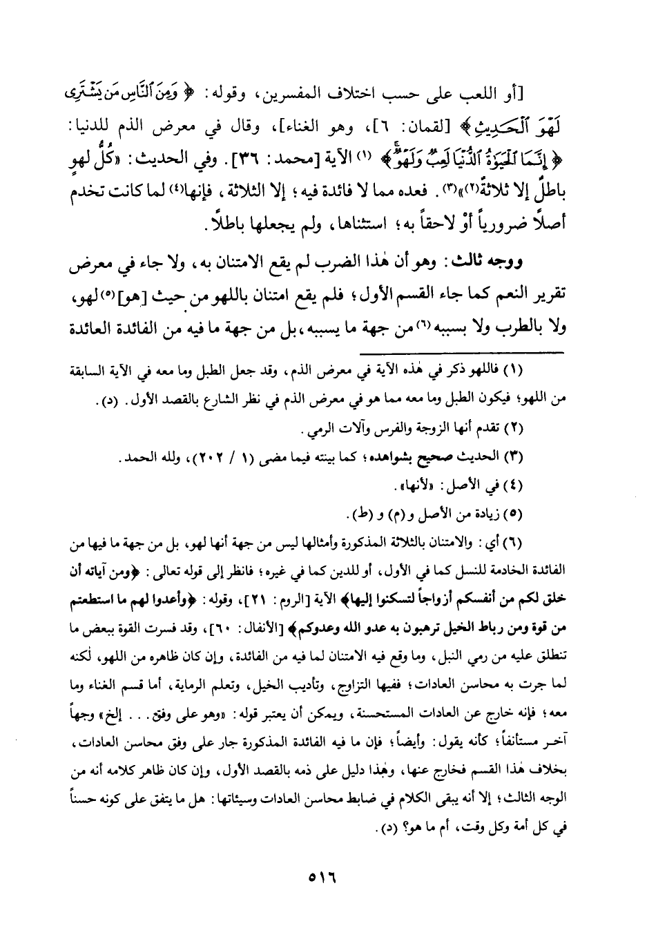 [أَوِ اللَّعِبَ عَلَى حَسَبِ اخْتِلَافِ الْمُفَسِّرِينَ، وَقَوْلِهِ: {وَمِنَ النَّاسِ مَنْ يَشْتَرِي لَهْوَ الْحَدِيثِ} [لُقْمَانَ: 6] ، وَهُوَ الْغِنَاءُ] ، وَقَالَ فِي مَعْرِضِ الذَّمِّ لِلدُّنْيَا: {إِنَّمَا الْحَيَاةُ الدُّنْيَا لَعِبٌ وَلَهْوٌ} 1 الْآيَةَ [مُحَمَّدٍ: 36] . وَفِي الْحَدِيثِ: "كُلُّ لَهْوٍ بَاطِلٌ إِلَّا ثَلَاثَةً2"3. فَعَدَّهُ مِمَّا لَا فَائِدَةَ فِيهِ؛ إِلَّا الثَّلَاثَةُ، فَإِنَّهَا4 لَمَّا كَانَتْ تَخْدِمُ أَصْلًا ضَرُورِيًّا أَوْ لَاحِقًا بِهِ؛ اسْتَثْنَاهَا، وَلَمْ يَجْعَلْهَا بَاطِلًا.