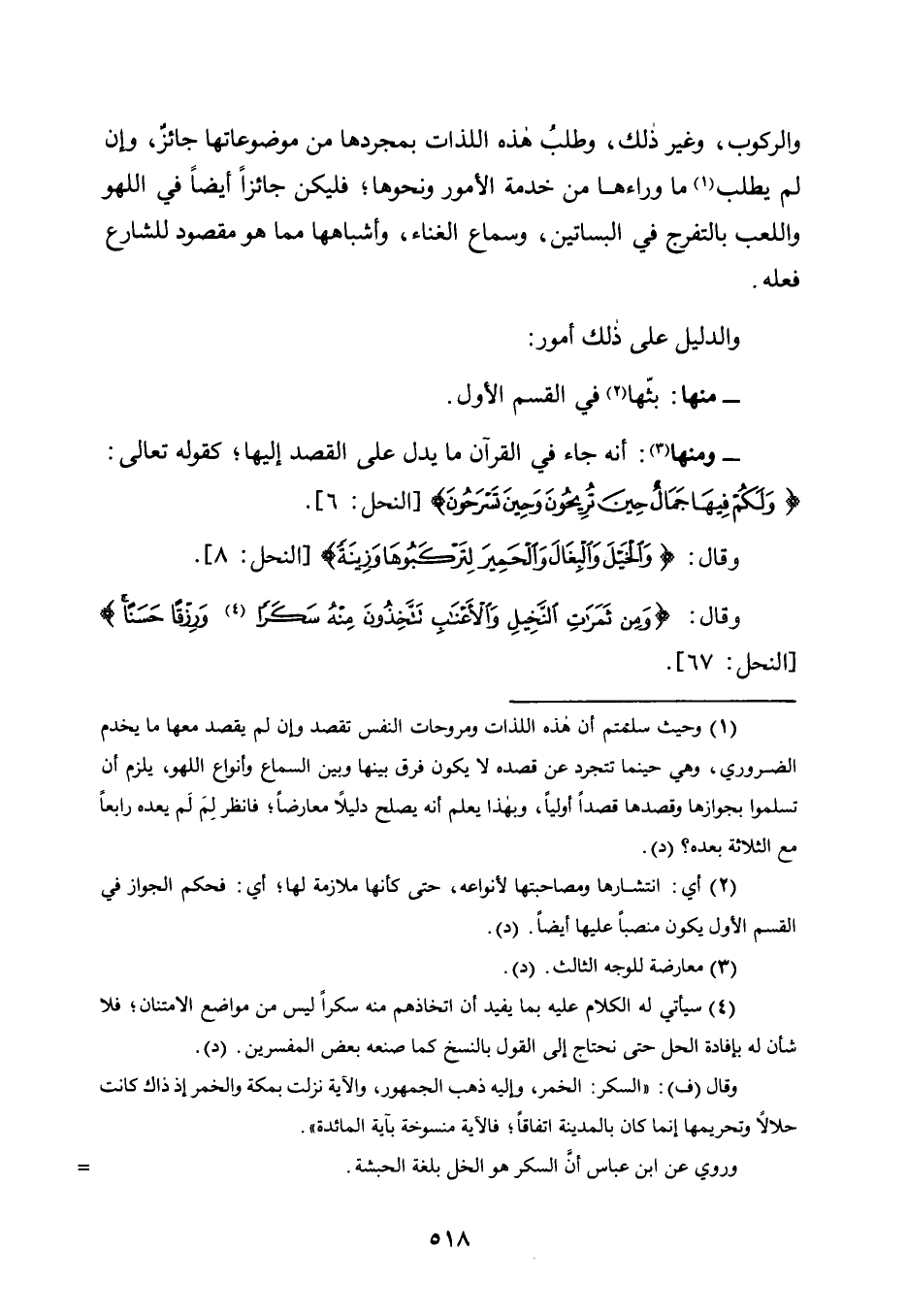 1 وحيث سلمتم أن هذه اللذات ومروحات النفس تقصد وإن لم يقصد معها ما يخدم الضروري، وهي حينما تتجرد عن قصده لا يكون فرق بينها وبين السماع وأنواع اللهو، يلزم أن تسلموا بجوازها وقصدها قصدًا أوليًّا، وبهذا يعلم أنه يصلح دليلًا معارضًا، فانظر لِمَ لَمْ يعده رابعًا مع الثلاثة بعده؟ "د".