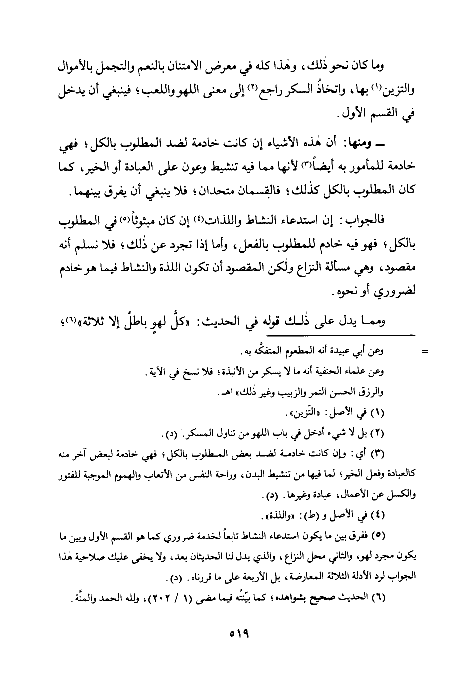 5 ففرق بين ما يكون استدعاء النشاط تابعًا لخدمة ضروري كما هو القسم الأول وبين ما يكون مجرد لهو، والثاني محل النزاع، والذي يدل لنا الحديثان بعد، ولا يخفى عليك صلاحية هذا الجواب لرد الأدلة الثلاثة المعارضة، بل الأربعة على ما قررناه. "د".