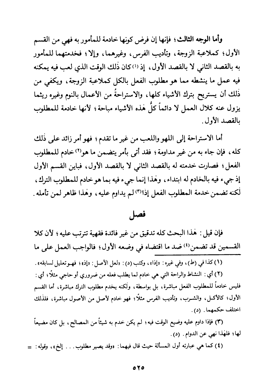 وَأَمَّا الْوَجْهُ الثَّالِثُ؛ فَإِنَّهَا إِنْ فُرِضَ كَوْنُهَا خَادِمَةً لِلْمَأْمُورِ بِهِ فَهِيَ مِنَ الْقِسْمِ الْأَوَّلِ؛ كَمُلَاعَبَةِ الزَّوْجَةِ، وَتَأْدِيبِ الْفَرَسِ، وَغَيْرِهِمَا، وَإِلَّا؛ فَخِدْمَتُهُمَا لِلْمَأْمُورِ بِهِ بِالْقَصْدِ الثَّانِي لَا بِالْقَصْدِ الْأَوَّلِ، إذ1 كَانَ ذَلِكَ الْوَقْتُ الَّذِي لَعِبَ فِيهِ يُمْكِنُهُ فِيهِ عَمَلُ مَا يُنَشِّطُهُ مِمَّا هُوَ مَطْلُوبُ الْفِعْلِ بِالْكُلِّ كَمُلَاعَبَةِ الزَّوْجَةِ، وَيَكْفِي مِنْ ذَلِكَ أَنْ يَسْتَرِيحَ بِتَرْكِ الْأَشْيَاءِ كُلِّهَا، وَالِاسْتِرَاحَةُ مِنَ الْأَعْمَالِ بِالنَّوْمِ وَغَيْرِهِ رَيْثَمَا يَزُولُ عَنْهُ كَلَالُ الْعَمَلِ لَا دَائِمًا كُلُّ هَذِهِ الْأَشْيَاءِ مُبَاحَةٌ؛ لِأَنَّهَا خَادِمَةٌ لِلْمَطْلُوبِ بِالْقَصْدِ الْأَوَّلِ.