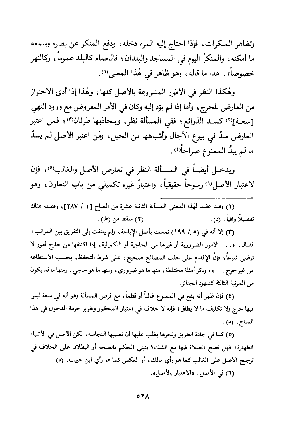 3 إلا أنه في "5/ 199" تمسك بأصل الإباحة، ولم يلتفت إلى التفريق بين المراتب؛ فقال: " ... الْأُمُورَ الضَّرُورِيَّةَ أَوْ غَيْرَهَا مِنَ الْحَاجِيَّةِ أَوِ التكميلية، إذا اكتنفها مِنْ خَارِجٍ أُمُورٌ لَا تُرْضَى شَرْعًا؛ فَإِنَّ الْإِقْدَامَ عَلَى جَلْبِ الْمَصَالِحِ صَحِيحٌ، عَلَى شَرْطِ التحفظ، بحسب الاستطاعة من غير حرج"، وذكر أمثلة مختلطة، منها ما هو ضروري، ومنها ما هو حاجي، ومنها ما قد يكون من المرتبة الثالثة كشهود الجنائز.