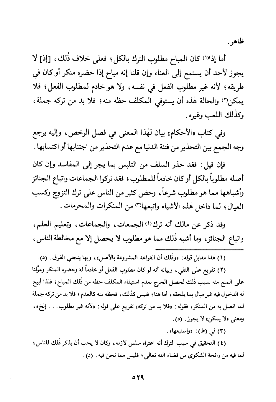 أَمَّا إِذَا1 كَانَ الْمُبَاحُ مَطْلُوبَ التَّرْكِ بِالْكُلِّ؛ فَعَلَى خِلَافِ ذَلِكَ، [إِذْ] لَا يَجُوزُ لِأَحَدٍ أَنْ يَسْتَمِعَ إِلَى الْغِنَاءِ وَإِنْ قُلْنَا إِنَّهُ مُبَاحٌ إِذَا حَضَرَهُ مُنْكِرٌ أَوْ كَانَ فِي طَرِيقِهِ؛ لِأَنَّهُ غَيْرُ مَطْلُوبِ الْفِعْلِ فِي نَفْسِهِ، وَلَا هُوَ خَادِمٌ لِمَطْلُوبِ الْفِعْلِ؛ فَلَا يُمْكِنُ2 وَالْحَالَةُ هَذِهِ أَنْ يَسْتَوْفِيَ الْمُكَلَّفُ حَظَّهُ مِنْهُ؛ فَلَا بُدَّ مِنْ تَرْكِهِ جُمْلَةً، وَكَذَلِكَ اللَّعِبُ وَغَيْرُهُ.