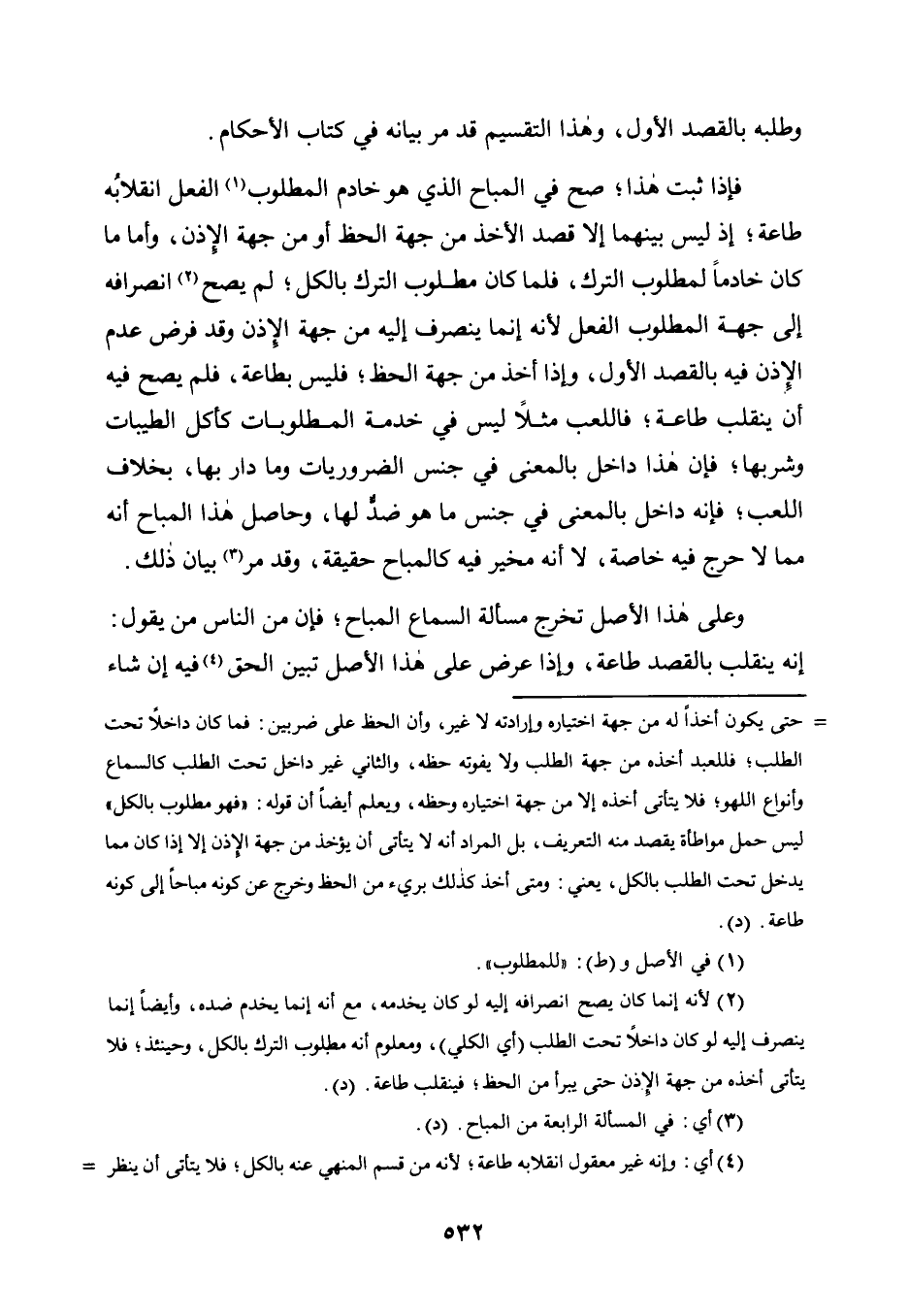 فَإِذَا ثَبَتَ هَذَا؛ صَحَّ فِي الْمُبَاحِ الَّذِي هُوَ خَادِمُ الْمَطْلُوبِ1 الْفِعْلِ انْقِلَابُهُ طَاعَةً؛ إِذْ لَيْسَ بَيْنَهُمَا إِلَّا قَصْدَ الْأَخْذِ مِنْ جِهَةِ الْحَظِّ أَوْ مِنْ جِهَةِ الْإِذْنِ، وَأَمَّا مَا كَانَ خَادِمًا لِمَطْلُوبِ التَّرْكِ، فَلَمَّا كَانَ مَطْلُوبَ التَّرْكِ بِالْكُلِّ؛ لَمْ يَصِحَّ2 انْصِرَافُهُ إِلَى جِهَةِ الْمَطْلُوبِ الْفِعْلِ لِأَنَّهُ إِنَّمَا يَنْصَرِفُ إِلَيْهِ مِنْ جِهَةِ الْإِذْنِ وَقَدْ فُرِضَ عَدَمُ الْإِذْنِ فِيهِ بِالْقَصْدِ الْأَوَّلِ، وَإِذَا أُخِذَ مِنْ جِهَةِ الْحَظِّ؛ فَلَيْسَ بِطَاعَةٍ، فَلَمْ يَصِحَّ فِيهِ أَنْ يَنْقَلِبَ طَاعَةً؛ فَاللَّعِبُ مَثَلًا لَيْسَ فِي خِدْمَةِ الْمَطْلُوبَاتِ كَأَكْلِ الطَّيِّبَاتِ وَشُرْبِهَا؛ فَإِنَّ هَذَا دَاخِلٌ بِالْمَعْنَى فِي جِنْسِ الضَّرُورِيَّاتِ وَمَا دَارَ بِهَا، بِخِلَافِ اللَّعِبِ، فَإِنَّهُ دَاخِلٌ بِالْمَعْنَى فِي جِنْسِ مَا هُوَ ضِدٌّ لَهَا، وَحَاصِلُ هَذَا الْمُبَاحِ أَنَّهُ مِمَّا لَا حَرَجَ فِيهِ خَاصَّةً، لَا أَنَّهُ مُخَيَّرٌ فِيهِ كَالْمُبَاحِ حَقِيقَةً، وَقَدْ مَرَّ3 بَيَانُ ذَلِكَ.