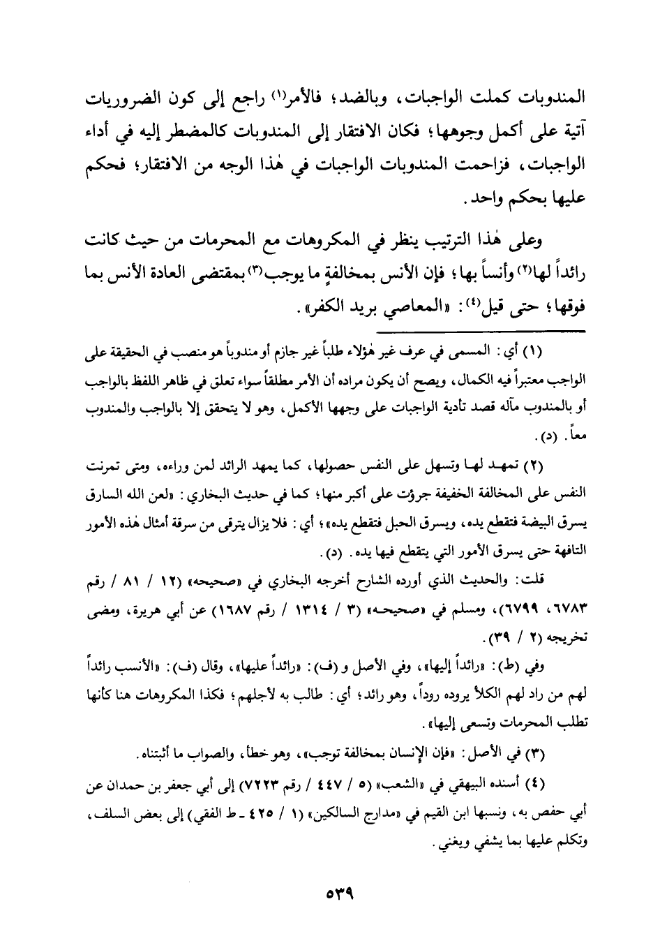 وَعَلَى هَذَا التَّرْتِيبِ يُنْظَرُ فِي الْمَكْرُوهَاتِ مَعَ الْمُحَرَّمَاتِ مِنْ حَيْثُ كَانَتْ رَائِدًا لَهَا2 وَأُنْسًا بَهَا؛ فَإِنَّ الْأُنْسَ بِمُخَالَفَةِ مَا يُوجِبُ3 بِمُقْتَضَى الْعَادَةِ الْأُنْسَ بِمَا فَوْقَهَا؛ حَتَّى قِيلَ4: "الْمَعَاصِي بَرِيدُ الكفر".