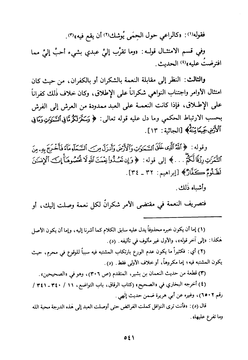 وَالثَّالِثُ: النَّظَرُ إِلَى مُقَابَلَةِ النِّعْمَةِ بِالشُّكْرَانِ أَوْ بِالْكُفْرَانِ، مِنْ حَيْثُ كَانَ امْتِثَالُ الأوامر واجتناب النواهي شكرانا على الإطلاق، وكان خلاف ذلك كفرانا عَلَى الْإِطْلَاقِ، فَإِذَا كَانَتِ النِّعْمَةُ عَلَى الْعَبْدِ مَمْدُودَةً مِنَ الْعَرْشِ إِلَى الْفَرْشِ بِحَسَبِ الِارْتِبَاطِ الْحُكْمِيِّ وَمَا دَلَّ عَلَيْهِ قَوْلُهُ تَعَالَى: {وَسَخَّرَ لَكُمْ مَا فِي السَّمَاوَاتِ وَمَا فِي الْأَرْضِ جَمِيعًا مِنْهُ} [الْجَاثِيَةِ: 13] .