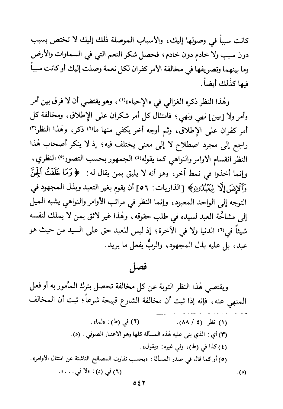 وَهَذَا النَّظَرُ ذَكَرَهُ الْغَزَّالِيُّ فِي "الْإِحْيَاءِ"1، وَهُوَ يَقْتَضِي أَنْ لَا فَرْقَ بَيْنَ أَمْرٍ وَأَمْرٍ وَلَا [بَيْنَ] نَهْيٍ وَنَهْيٍ؛ فَامْتِثَالُ كُلِّ أَمْرٍ شُكْرَانٌ عَلَى الْإِطْلَاقِ، وَمُخَالَفَةُ كُلِّ أَمْرٍ كُفْرَانٌ على الإطلاق، ثم أَوْجُهٌ أُخَرُ يَكْفِي مِنْهَا مَا2 ذُكِرَ، وَهَذَا النَّظَرُ3 رَاجِعٌ إِلَى مُجَرَّدِ اصْطِلَاحٍ لَا إِلَى مَعْنًى يُخْتَلَفُ فِيهِ؛ إِذْ لَا يُنْكِرُ أَصْحَابُ هذا النظر انقسام الأوامر والنواهي كما يقوله4 الْجُمْهُورُ بِحَسَبِ التَّصَوُّرِ5 النَّظَرِيِّ، وَإِنَّمَا أَخَذُوا فِي نَمَطٍ آخَرَ، وَهُوَ أَنَّهُ لَا يَلِيقُ بِمَنْ يُقَالُ لَهُ: {وَمَا خَلَقْتُ الْجِنَّ وَالْأِنْسَ إِلَّا لِيَعْبُدُونِ} [الذَّارِيَاتِ: 56] أَنْ يَقُومَ بِغَيْرِ التَّعَبُّدِ وَبَذْلِ الْمَجْهُودِ فِي التَّوَجُّهِ إِلَى الْوَاحِدِ الْمَعْبُودِ، وَإِنَّمَا النَّظَرُ فِي مَرَاتِبِ الْأَوَامِرِ وَالنَّوَاهِي يُشْبِهُ الْمَيْلَ إلى مساحة الْعَبْدِ لِسَيِّدِهِ فِي طَلَبِ حُقُوقِهِ، وَهَذَا غَيْرُ لائق بمن لا يملك لنفسه شيئًا فِي6 الدُّنْيَا وَلَا فِي الْآخِرَةِ؛ إِذْ لَيْسَ لِلْعَبْدِ حَقٌّ عَلَى السَّيِّدِ مِنْ حَيْثُ هُوَ عَبْدٌ، بَلْ عَلَيْهِ بَذْلُ الْمَجْهُودِ، وَالرَّبُّ يَفْعَلُ مَا يُرِيدُ.