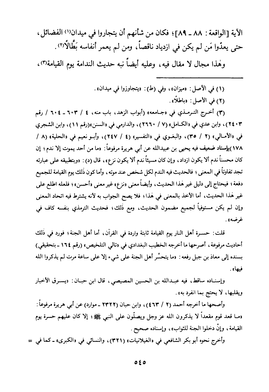 3 أخرج الترمذي في "جامعه" "أبواب الزهد، باب منه، 4/ 603-604/ رقم 2403"، وابن عدي في "الكامل" "7/ 2660"، والدارمي في "السنن" "رقم 11"، وابن الشجري في "الأمالي" "2/ 35"، والبغوي في "التفسير" "4/ 247"، وأبو نعيم في "الحلية" "8/ 178" بإسناد ضعيف فيه يحيى بن عبيد الله عن أبي هريرة مرفوعًا: "ما من أحد يموت إلا ندم؛ إن كان محسنًا ندم ألا يكون ازداد، وإن كان مسيئًا ندم ألا يكون نزع"، قال "د": "وبتطبيقه على عبارته تجد تفاوتا في المعنى؛ فالحديث فيه الندم لكل شخص عند موته، وأما كون ذلك يوم القيامة للجميع دفعة؛ فيحتاج إلى دليل غير هذا الحديث، وأيضًا معنى "نزع" غير معنى "أحسن"؛ فلعله اطلع على غير هذا الحديث، أما الأخذ بالمعنى في هذا؛ فلا يصح الجواب به لأنه يشترط فيه اتحاد المعنى وإن لم يكن مستوفيًا لجميع مضمون الحديث، ومع ذلك؛ فحديث الترمذي بنفسه كاف في غرضه".