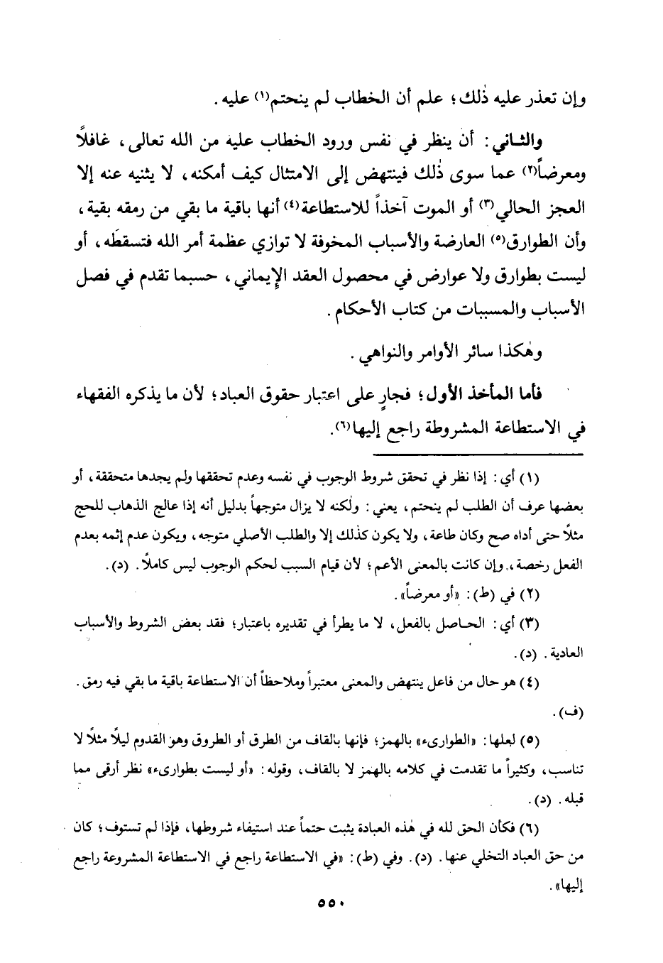فَأَمَّا الْمَأْخَذُ الْأَوَّلُ: فجارٍ عَلَى اعْتِبَارِ حُقُوقِ الْعِبَادِ؛ لِأَنَّ مَا يَذْكُرُهُ الْفُقَهَاءُ فِي الاستطاعة المشروطة راجع إليها6.