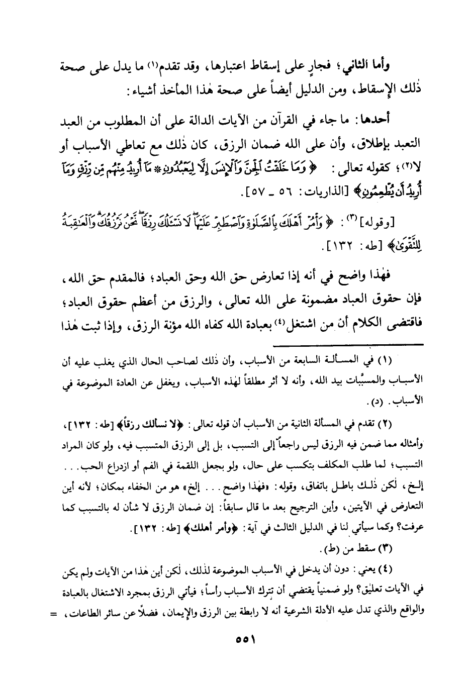 2 تقدم في المسألة الثانية من الأسباب أن قوله تعالى: {لا نَسْأَلُكَ رِزْقًا} [طه: 132] ، وأمثاله مما ضمن فيه الرزق ليس راجعًا إلى التسبب، بل إلى الرزق المتسبب فيه، ولو كان المراد التسبب؛ لما طلب المكلف بتكسب عَلَى حَالٍ، وَلَوْ بِجَعْلِ اللُّقْمَةِ فِي الْفَمِ أو ازدراع الحب ... إلخ، لكن ذلك باطل باتفاق، وقوله: "فهذا واضح ... إلخ" هو من الخفاء بمكان؛ لأنه أين التعارض في الآيتين، وأين الترجيح بعد ما قال سابقا: إن ضمان الرزق لا شأن له بالتسبب كما عرفت؟ وكما سيأتي لنا في الدليل الثالث في آية: {وَأْمُرْ أَهْلَكَ} [طه: 132] .