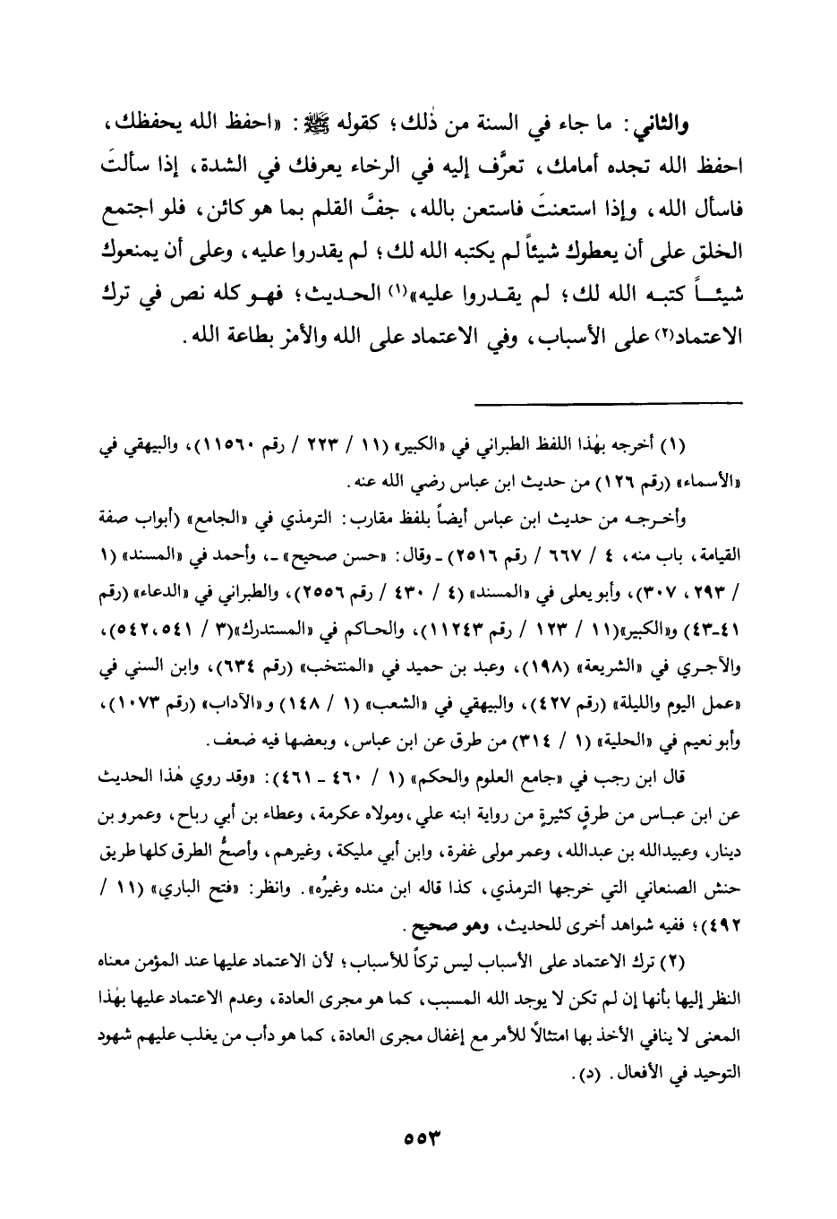 وَالثَّانِي: مَا جَاءَ فِي السُّنَّةِ مِنْ ذَلِكَ؛ كَقَوْلِهِ صَلَّى اللَّهُ عَلَيْهِ وَسَلَّمَ: "احْفَظِ اللَّهَ يَحْفَظْكَ، احْفَظِ اللَّهَ تَجِدْهُ أَمَامَكَ، تَعَرَّفْ إِلَيْهِ فِي الرَّخَاءِ يَعْرِفْكَ فِي الشِّدَّةِ، إِذَا سَأَلْتَ فَاسْأَلِ اللَّهَ، وَإِذَا اسْتَعَنْتَ فَاسْتَعِنْ بِاللَّهِ، جَفَّ الْقَلَمُ بِمَا هُوَ كَائِنٌ، فَلَوِ اجْتَمَعَ الْخَلْقُ عَلَى أَنْ يُعْطُوكَ شَيْئًا لَمْ يَكْتُبْهُ اللَّهُ لَكَ؛ لَمْ يَقْدِرُوا عَلَيْهِ، وَعَلَى أَنْ يَمْنَعُوكَ شَيْئًا كَتَبَهُ اللَّهُ لَكَ؛ لَمْ يَقْدِرُوا عَلَيْهِ" 1 الْحَدِيثَ؛ فَهُوَ كُلُّهُ نَصٌّ فِي تَرْكِ الِاعْتِمَادِ2 عَلَى الْأَسْبَابِ، وَفِي الِاعْتِمَادِ عَلَى اللَّهِ وَالْأَمْرِ بطاعة الله.