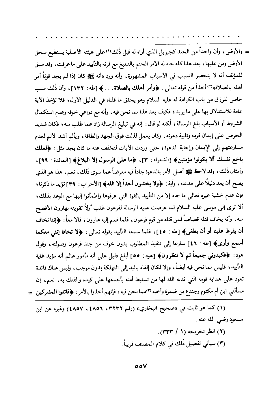 = والأرض، وأن واحدا من الجند كجبريل الذي أراه له قبل ذلك1 على هيئته الأصلية يستطيع سحق الأرض ومن عليها، بعد هذا كله جاء له الأمر الحتم بالتبليغ مع قرنه بالتأييد على ما عرفت، وقد سبق للمؤلف أنه لا ينحصر التسبب في الأسباب المشهورة، وأنه ورد أنه صلى الله عليه وسلم كان إذا لم يجد قوتا أمر أهله بالصلاة"2 أخذا من قوله تعالى: {وَأْمُرْ أَهْلَكَ بِالصَّلاةِ ... } [طه: 132] ، وأن ذلك سبب خاص للرزق من باب الكرامة له عليه السلام وهو يحقق ما قلناه في الدليل الأول؛ فلا تؤخذ الآية عامة للاستدلال بها على ما يريد؛ فكيف يعد هذا مما نحن فيه، وأنه مع دواعي خوفه وعدم استكمال الشروط أو الأسباب بلغ الرسالة؛ لكنه لو قال: إنه في تبليغ الرسالة زاد عما طلب منه؛ فكان شديد الحرص على إيمان قومه وتلبية دعوته، وكان يعمل لذلك فوق الجهد والطاقة، ويألم أشد الألم لعدم مسارعتهم إلى الإيمان وإجابة الدعوة؛ حتى وردت الآيات لتخفف عنه ما كان يجد مثل: {لَعَلَّكَ بَاخِعٌ نَفْسَكَ أَلَّا يَكُونُوا مُؤْمِنِينَ} [الشعراء: 3] ، {وَمَا عَلَى الرَّسُولِ إِلَّا الْبَلاغُ الْمُبِينُ} [المائدة: 99] ، وأمثال ذلك، وقد لاحظ صلى الله عليه وسلم أصل الأمر بالدعوة جادا فيه معرضا عما سوى ذلك، نعم، هذا هو الذي يصح أن يعد دليلا على مدعاه، وآية: {وَلا يَخْشَوْنَ أَحَدًا إِلَّا اللَّهَ} [الأحزاب: 39] تؤيد ما ذكرنا؛ فإن عدم خشية غيره تعالى ما جاء إلا من التأييد بالقوة التي عرفوها واطمأنوا إليها مع الوعد بذلك؛ ألا ترى إلى موسى عليه السلام لما عرضت عليه الرسالة لفرعون طلب أولا تقويته بهارون الأفصح منه، وأنه يخاف قتله قصاصا لمن قتله من قوم فرعون، فلما ضم إليه هارون؛ قالا معا: {إِنَّنَا نَخَافُ أَنْ يَفْرُطَ عَلَيْنَا أَوْ أَنْ يَطْغَى} [طه: 45] ، فلما سمعا التأييد بقوله تعالى: {لا تَخَافَا إِنَّنِي مَعَكُمَا أَسْمَعُ وَأَرَى} [طه: 46] سارعا إلى تنفيذ المطلوب بدون خوف من جند فرعون وصولته، وقول هود: {فَكِيدُونِي جَمِيعًا ثُمَّ لا تُنْظِرُونِ} [هود: 55] أبلغ دليل على أنه مأمور عالم أنه مؤيد غاية التأييد؛ فليس مما نحن فيه أيضًا، وإلا لكان إلقاء باليد إلى التهلكة بدون موجب، وليس هناك فائدة تعود على هداية قومه التي ندبه الله لها من تسليط أمته بأجمعها على كيده والفتك به، نعم، إن مسألتي ابن أم مكتوم وجندع بن ضمرة وأخيه3 مما نحن فيه؛ فإنهم أخذوا بالأمر: {قَاتِلُوا الْمُشْرِكِينَ كَافَّةً كَمَا يُقَاتِلُونَكُمْ كَافَّةً} [التوبة: 36] بدون نظر إلى الرخصة في قوله تعالى: {لَيْسَ عَلَى الْأَعْمَى حَرَجٌ وَلا عَلَى الْأَعْرَجِ حَرَجٌ وَلا عَلَى الْمَرِيضِ حَرَجٌ} [الفتح: 17] ، وذلك داخل في الرخصة بالإطلاق الأول المشهور؛ إذ أن ذلك جاء بلفظ رفع الحرج أي مع بقاء أصل الطلب متوجها وإن لم يكن حتما. "د".